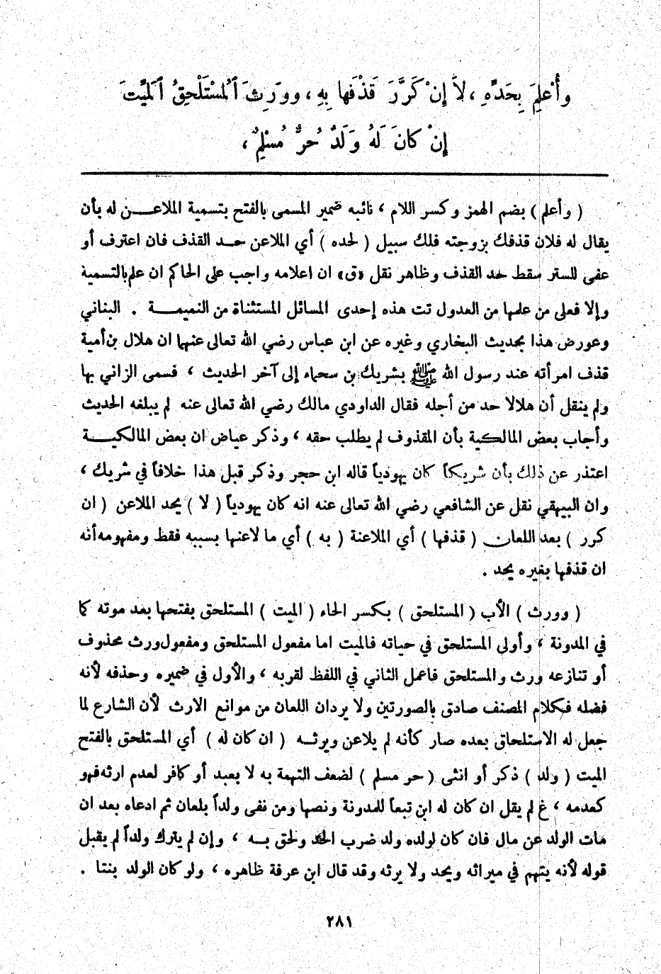 (وَوَرِثَ) الْأَبُ (الْمُسْتَلْحِقُ) بِكَسْرِ الْحَاءِ (الْمَيِّتَ) الْمُسْتَلْحَقَ بِفَتْحِهَا بَعْدَ مَوْتِهِ كَمَا فِي الْمُدَوَّنَةِ وَأَوْلَى الْمُسْتَلْحَقُ فِي حَيَاتِهِ فَالْمَيِّتُ إمَّا مَفْعُولُ الْمُسْتَلْحِقِ وَمَفْعُولُ وَرِثَ مَحْذُوفٌ أَوْ تَنَازَعَهُ وَرِثَ وَالْمُسْتَلْحِقُ فَأُعْمِلَ الثَّانِي فِي اللَّفْظِ لِقُرْبِهِ، وَالْأَوَّلُ فِي ضَمِيرِهِ وَحَذَفَهُ لِأَنَّهُ فَضْلَةٌ فَكَلَامُ الْمُصَنِّفِ صَادِقٌ بِالصُّورَتَيْنِ وَلَا يُرَدُّ أَنَّ اللِّعَانَ مِنْ مَوَانِعِ الْإِرْثِ لِأَنَّ الشَّارِعَ لَمَّا جَعَلَ لَهُ الِاسْتِلْحَاقَ بَعْدَهُ صَارَ كَأَنَّهُ لَمْ يُلَاعِنْ وَيَرِثُهُ (إنْ كَانَ لَهُ) أَيْ الْمُسْتَلْحَقِ بِالْفَتْحِ الْمَيِّتِ (وَلَدٌ) ذَكَرٌ أَوْ أُنْثَى (حُرٌّ مُسْلِمٌ) لِضَعْفِ التُّهْمَةِ بِهِ لَا بِعَبْدٍ أَوْ كَافِرٍ لِعَدَمِ إرْثِهِ فَهُوَ كَعَدَمِهِ غ لَمْ يَقُلْ إنْ كَانَ لَهُ ابْنٌ تَبَعًا لِلْمُدَوَّنَةِ وَنَصُّهَا " وَمَنْ نَفَى وَلَدًا بِلِعَانٍ ثُمَّ ادَّعَاهُ بَعْدَ أَنْ مَاتَ الْوَلَدُ عَنْ مَالٍ فَإِنْ كَانَ لِوَلَدِهِ وَلَدٌ ضُرِبَ الْحَدَّ وَلَحِقَ بِهِ، وَإِنْ لَمْ يَتْرُكْ وَلَدًا لَمْ يُقْبَلْ قَوْلُهُ لِأَنَّهُ يُتَّهَمُ فِي مِيرَاثِهِ وَيُحَدُّ وَلَا يَرِثُهُ وَقَدْ قَالَ ابْنُ عَرَفَةَ ظَاهِرُهُ، وَلَوْ كَانَ الْوَلَدُ بِنْتًا.