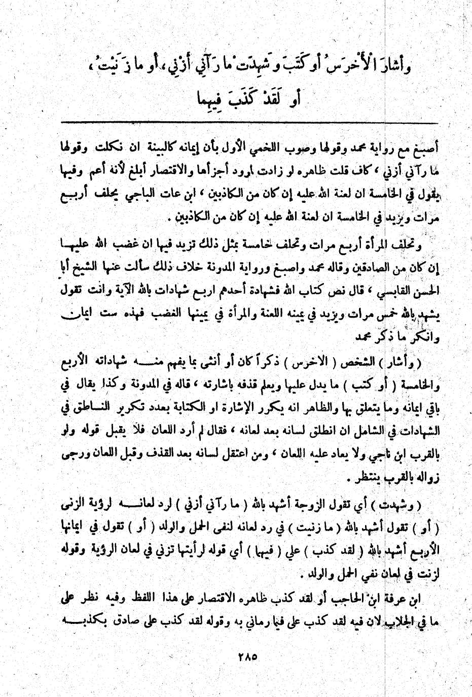 ابْنُ عَرَفَةَ ابْنُ الْحَاجِبِ أَوْ لَقَدْ كَذَبَ ظَاهِرُهُ الِاقْتِصَارُ عَلَى هَذَا اللَّفْظِ وَفِيهِ نَظَرٌ عَلَى مَا فِي الْجَلَّابِ لِأَنَّ فِيهِ لَقَدْ كَذَبَ عَلَيَّ فِيمَا رَمَانِي بِهِ، وَقَوْلُهُ لَقَدْ كَذَبَ عَلَيَّ صَادِقٌ بِكَذِبِهِ