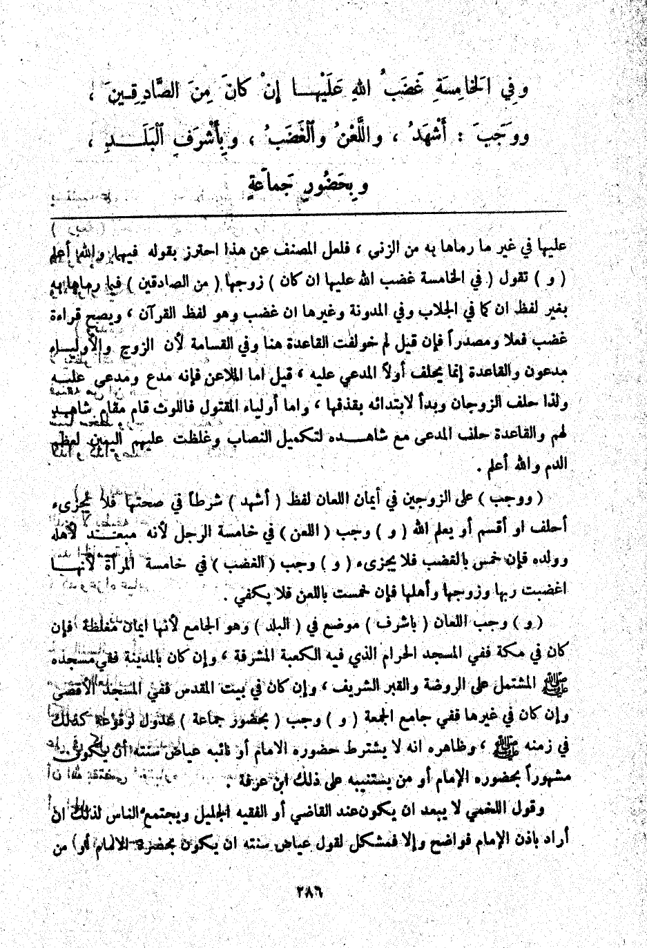 وَوَجَبَ عَلَى الزَّوْجَيْنِ فِي أَيْمَانِ اللِّعَانِ وَوَجَبَ: أَشْهَدُ، وَاللَّعْنُ وَالْغَضَبُ، وَبِأَشْرَفِ الْبَلَدِ، وَبِحُضُورِ جَمَاعَةٍ