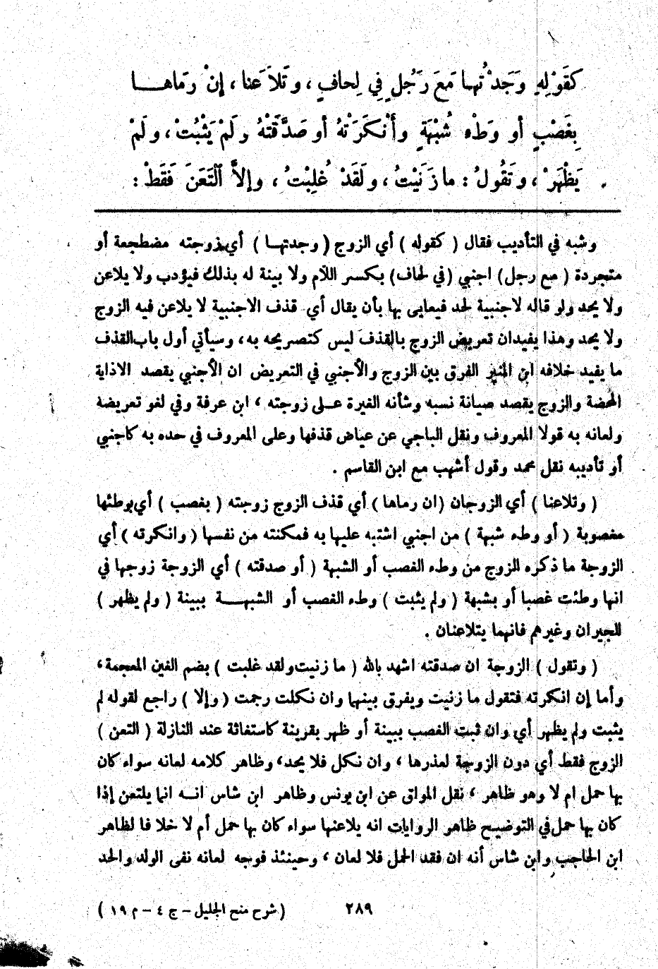 ـــــــــــــــــــــــــــــQوَشَبَّهَ فِي التَّأْدِيبِ فَقَالَ (كَقَوْلِهِ) أَيْ الزَّوْجِ (وَجَدْتهَا) أَيْ زَوْجَتَهُ مُضْطَجِعَةً أَوْ مُتَجَرِّدَةً (مَعَ رَجُلٍ) أَجْنَبِيٍّ (فِي لِحَافٍ) بِكَسْرِ اللَّامِ وَلَا بَيِّنَةَ لَهُ بِذَلِكَ فَيُؤَدَّبُ وَلَا يُلَاعِنُ وَلَا يُحَدُّ وَلَوْ قَالَهُ لِأَجْنَبِيَّةٍ لَحُدَّ فَيُعَابُ بِهَا بِأَنْ يُقَالَ أَيْ قَذْفُ الْأَجْنَبِيَّةِ لَا يُلَاعِنُ فِيهِ الزَّوْجُ وَلَا يُحَدُّ وَهَذَا يُفِيدُ أَنَّ تَعْرِيضَ الزَّوْجِ بِالْقَذْفِ لَيْسَ كَتَصْرِيحِهِ بِهِ وَسَيَأْتِي أَوَّلَ بَابِ الْقَذْفِ مَا يُفِيدُ خِلَافَهُ ابْنُ الْمُنِيرِ الْفَرْقُ بَيْنَ الزَّوْجِ وَالْأَجْنَبِيِّ فِي التَّعْرِيضِ أَنَّ الْأَجْنَبِيَّ يَقْصِدُ الْإِذَايَةَ الْمَحْضَةَ وَالزَّوْجَ يَقْصِدُ صِيَانَةَ نَسَبِهِ وَشَأْنُهُ الْغَيْرَةُ عَلَى زَوْجَتِهِ ابْنُ عَرَفَةَ وَفِي لَغْوِ تَعْرِيضِهِ وَلِعَانِهِ بِهِ قَوْلَا الْمَعْرُوفِ، وَنَقَلَ الْبَاجِيَّ عَنْ عِيَاضٍ قَذْفَهَا، وَعَلَى الْمَعْرُوفِ فِي حَدِّهِ بِهِ كَأَجْنَبِيٍّ أَوْ تَأْدِيبِهِ نَقْلُ مُحَمَّدٍ وَقَوْلُ أَشْهَبَ مَعَ ابْنِ الْقَاسِمِ