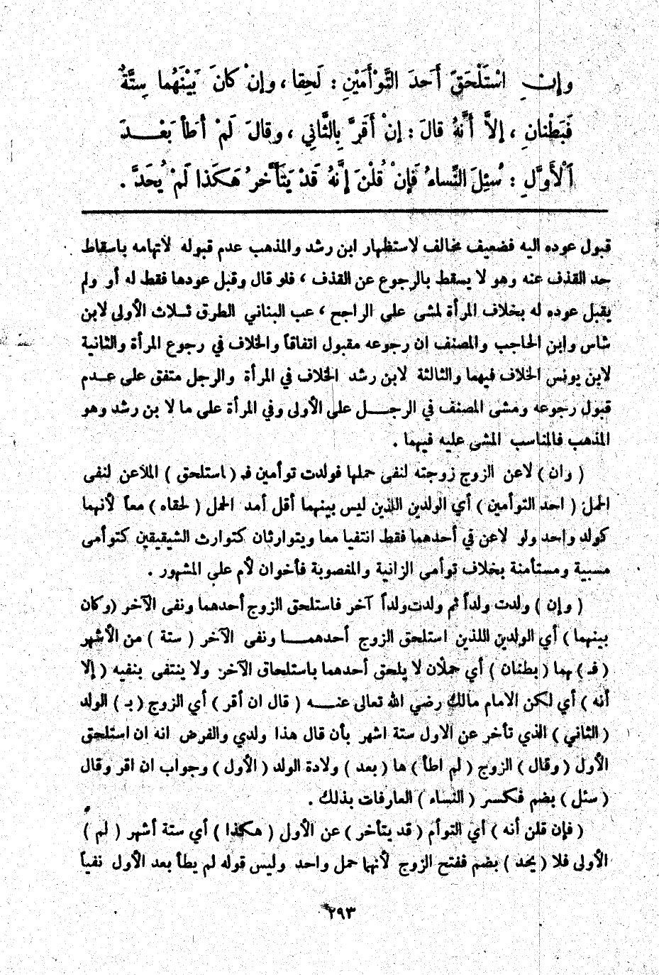 (فَإِنْ قُلْنَ إنَّهُ) أَيْ التَّوْأَمُ (قَدْ يَتَأَخَّرُ) عَنْ الْأَوَّلِ (هَكَذَا) أَيْ سِتَّةَ أَشْهُرٍ (لَمْ) الْأُولَى فَلَا (يُحَدَّ) بِضَمٍّ فَفَتْحٍ الزَّوْجُ لِأَنَّهُمَا حَمْلٌ وَاحِدٌ وَلَيْسَ قَوْلُهُ: لَمْ يَطَأْ بَعْدَ الْأَوَّلِ نَفْيًا