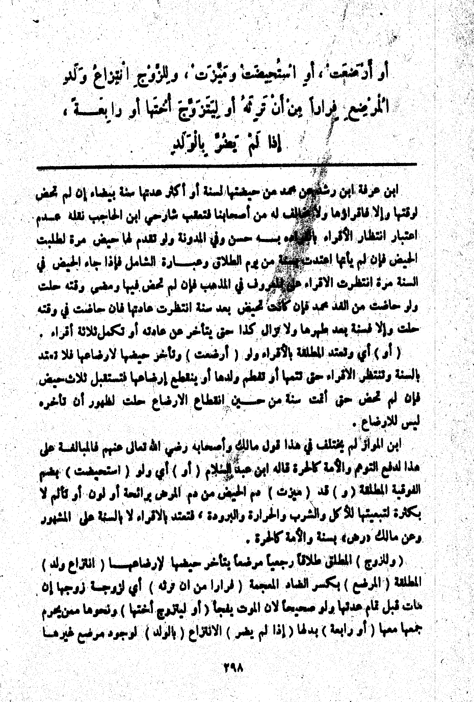 ـــــــــــــــــــــــــــــQابْنُ عَرَفَةَ ابْنُ رُشْدٍ عَنْ مُحَمَّدٍ مَنْ حَيْضَتُهَا لِسَنَةٍ أَوْ أَكْثَرَ عِدَّتُهَا سَنَةٌ بَيْضَاءُ إنْ لَمْ تَحِضْ لِوَقْتِهَا وَإِلَّا فَأَقْرَاؤُهَا وَلَا مُخَالِفَ لَهُ مِنْ أَصْحَابِنَا فَتَعَقَّبَ شَارِحِي ابْنِ الْحَاجِبِ نَقْلَهُ عَدَمُ اعْتِبَارِ انْتِظَارِ الْإِقْرَارِ بِانْفِرَادِهِ بِهِ حَسَنٌ.