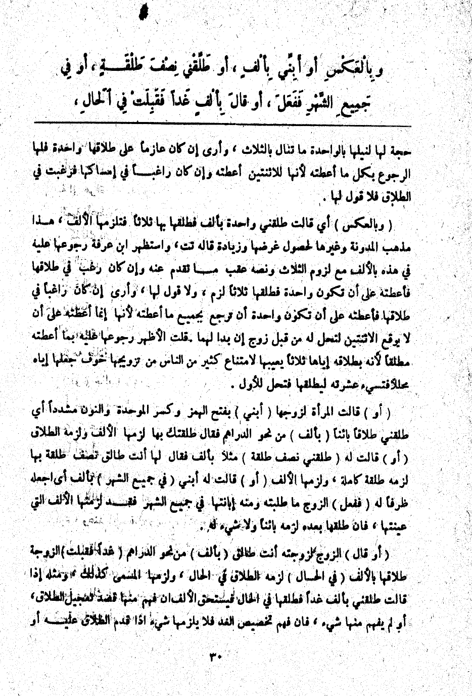 (أَوْ) قَالَتْ الْمَرْأَةُ لِزَوْجِهَا (أَبِنِّي) بِفَتْحِ الْهَمْزِ وَكَسْرِ الْمُوَحَّدَةِ وَالنُّونِ مُشَدَّدًا أَيْ طَلِّقْنِي طَلَاقًا بَائِنًا (بِأَلْفٍ) مِنْ نَحْوِ الدَّرَاهِمِ فَقَالَ: طَلَّقْتُكِ بِهَا لَزِمَهَا الْأَلْفُ وَلَزِمَهُ الطَّلَاقُ (أَوْ) قَالَتْ لَهُ (طَلِّقْنِي نِصْفَ طَلْقَةٍ) مَثَلًا بِأَلْفٍ فَقَالَ لَهَا أَنْتِ طَالِقٌ نِصْفَ طَلْقَةٍ بِهَا لَزِمَهُ طَلْقَةٌ كَامِلَةٌ، وَلَزِمَهَا الْأَلْفُ (أَوْ) قَالَتْ لَهُ أَبِنِّي (فِي جَمِيعِ الشَّهْرِ) بِأَلْفٍ أَيْ اجْعَلْهُ ظَرْفًا لَهُ (فَفَعَلَ) الزَّوْجُ مَا طَلَبَتْهُ وَمِنْهُ إبَانَتُهَا فِي جَمِيعِ الشَّهْرِ فَقَدْ لَزِمَتْهَا الْأَلْفُ الَّتِي عَيَّنَتْهَا، فَإِنْ طَلَّقَهَا بَعْدَهُ لَزِمَهُ بَائِنًا وَلَا شَيْءَ لَهُ.