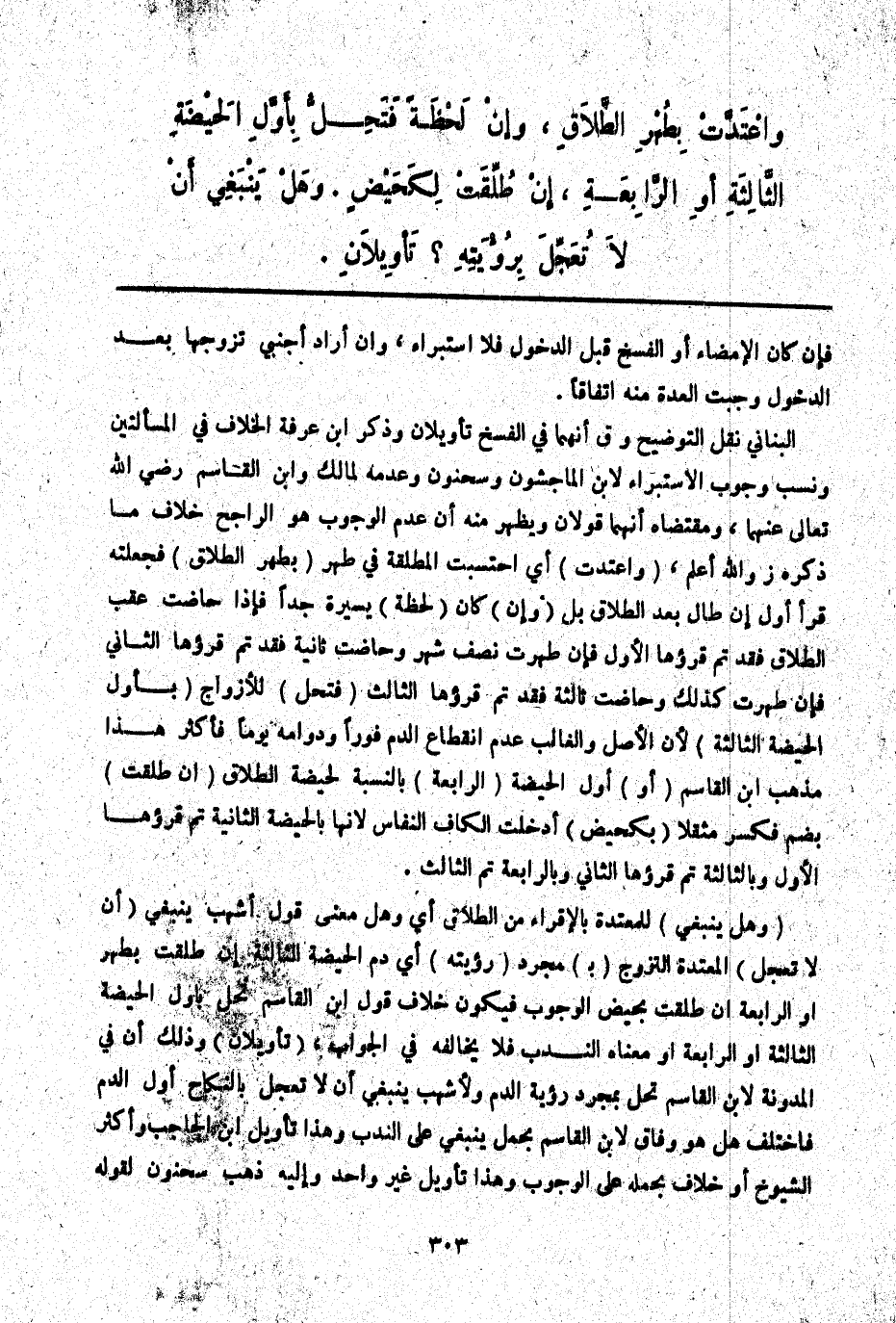(وَهَلْ يَنْبَغِي) لِلْمُعْتَدَّةِ بِالْأَقْرَاءِ مِنْ الطَّلَاقِ أَيْ وَهَلْ مَعْنَى قَوْلِ أَشْهَبَ يَنْبَغِي (أَنْ لَا تُعَجِّلَ) الْمُعْتَدَّةُ التَّزَوُّجَ (ب) مُجَرَّدِ (رُؤْيَتِهِ) أَيْ دَمِ الْحَيْضَةِ الثَّالِثَةِ إنْ طَلُقَتْ بِطُهْرٍ أَوْ الرَّابِعَةِ إنْ طَلُقَتْ بِحَيْضِ الْوُجُوبِ فَيَكُونُ خِلَافَ قَوْلِ ابْنِ الْقَاسِمِ تَحِلُّ بِأَوَّلِ الْحَيْضَةِ الثَّالِثَةِ أَوْ الرَّابِعَةِ أَوْ مَعْنَاهُ النَّدْبُ فَلَا يُخَالِفُهُ فِي الْجَوَابِ، (تَأْوِيلَانِ) وَذَلِكَ أَنَّ فِي الْمُدَوَّنَةِ لِابْنِ الْقَاسِمِ تَحِلُّ بِمُجَرَّدِ رُؤْيَةِ الدَّمِ وَلِأَشْهَبَ يَنْبَغِي أَنْ لَا تُعَجِّلَ بِالنِّكَاحِ أَوَّلَ الدَّمِ فَاخْتُلِفَ هَلْ هُوَ وِفَاقٌ لِابْنِ الْقَاسِمِ بِحَمْلِ يَنْبَغِي عَلَى النَّدْبِ وَهَذَا تَأْوِيلُ ابْنِ الْحَاجِبِ وَأَكْثَرِ الشُّيُوخِ أَوْ خِلَافٌ بِحَمْلِهِ عَلَى الْوُجُوبِ وَهَذَا تَأْوِيلُ غَيْرِ وَاحِدٍ وَإِلَيْهِ ذَهَبَ سَحْنُونٌ لِقَوْلِهِ
