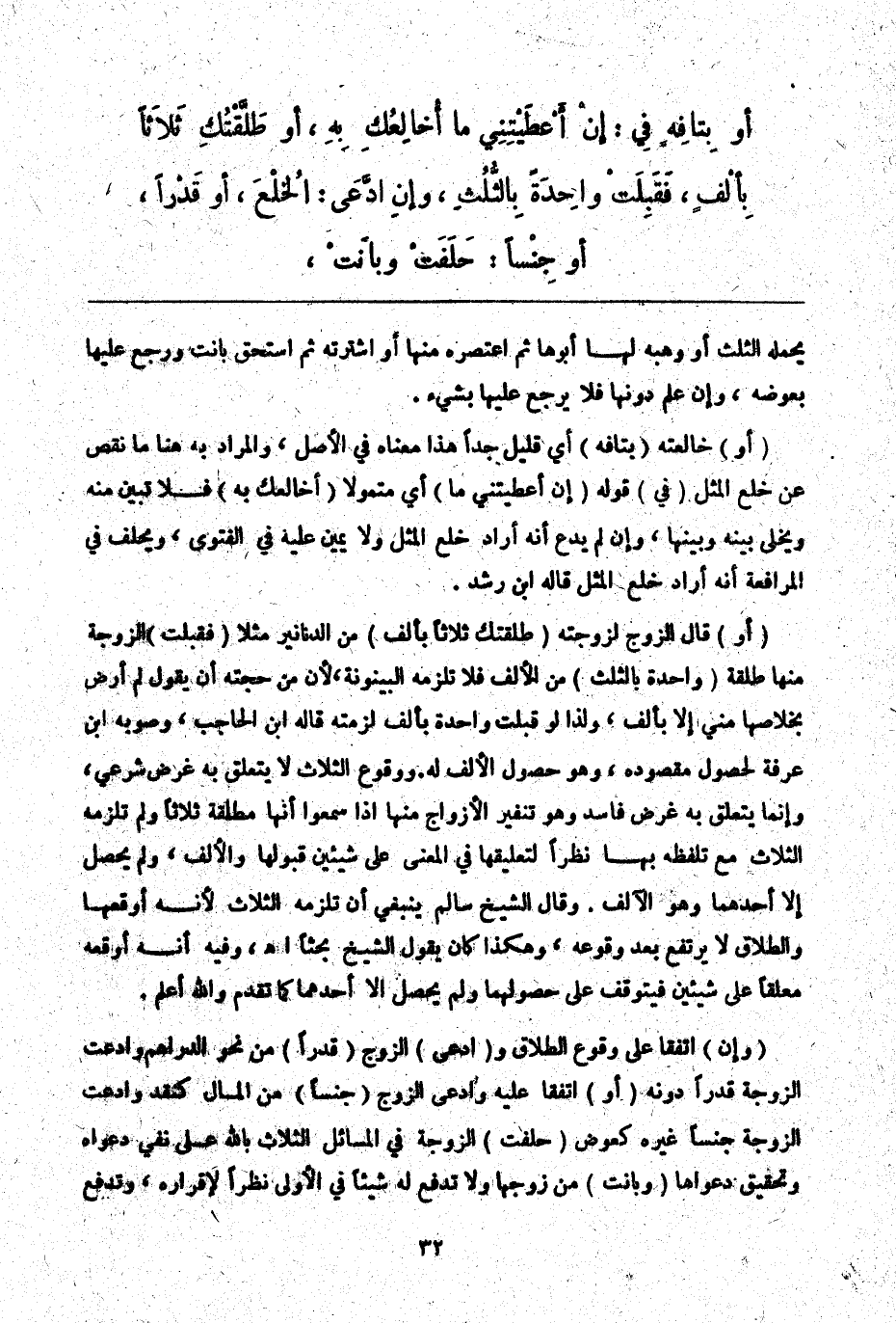 (أَوْ) قَالَ الزَّوْجُ لِزَوْجَتِهِ (طَلَّقْتُكِ ثَلَاثًا بِأَلْفٍ) مِنْ الدَّنَانِيرِ مَثَلًا (فَقَبِلَتْ) الزَّوْجَةُ مِنْهَا طَلْقَةً (وَاحِدَةً بِالثُّلُثِ) مِنْ الْأَلْفِ فَلَا تَلْزَمُهُ الْبَيْنُونَةُ؛ لِأَنَّ مِنْ حُجَّتِهِ أَنْ يَقُولَ لَمْ أَرْضَ بِخَلَاصِهَا مِنِّي إلَّا بِأَلْفٍ، وَلِذَا لَوْ قَبِلَتْ وَاحِدَةً بِأَلْفٍ لَزِمَتْهُ قَالَهُ ابْنُ الْحَاجِبِ، وَصَوَّبَهُ ابْنُ عَرَفَةَ لِحُصُولِ مَقْصُودِهِ، وَهُوَ حُصُولُ الْأَلْفِ لَهُ. وَوُقُوعُ الثَّلَاثِ لَا يَتَعَلَّقُ بِهِ غَرَضٌ شَرْعِيٌّ، وَإِنَّمَا يَتَعَلَّقُ بِهِ غَرَضٌ فَاسِدٌ وَهُوَ تَنْفِيرُ الْأَزْوَاجِ مِنْهَا إذَا سَمِعُوا أَنَّهَا مُطَلَّقَةٌ ثَلَاثًا وَلَمْ تَلْزَمْهُ الثَّلَاثُ مَعَ تَلَفُّظِهِ بِهَا نَظَرًا لِتَعْلِيقِهَا فِي الْمَعْنَى عَلَى شَيْئَيْنِ قَبُولِهَا وَالْأَلْفِ، وَلَمْ يَحْصُلْ إلَّا أَحَدُهُمَا وَهُوَ الْأَلْفُ. وَقَالَ الشَّيْخُ سَالِمٌ يَنْبَغِي أَنْ تَلْزَمَهُ الثَّلَاثُ؛ لِأَنَّهُ أَوْقَعَهَا وَالطَّلَاقُ لَا يَرْتَفِعُ بَعْدَ وُقُوعِهِ، وَهَكَذَا كَانَ يَقُولُ الشَّيْخُ بَحْثًا. اهـ. وَفِيهِ أَنَّهُ أَوْقَعَهُ مُعَلَّقًا عَلَى شَيْئَيْنِ فَيَتَوَقَّفُ عَلَى حُصُولِهِمَا وَلَمْ يَحْصُلْ إلَّا أَحَدُهُمَا كَمَا تَقَدَّمَ وَاَللَّهُ أَعْلَمُ.