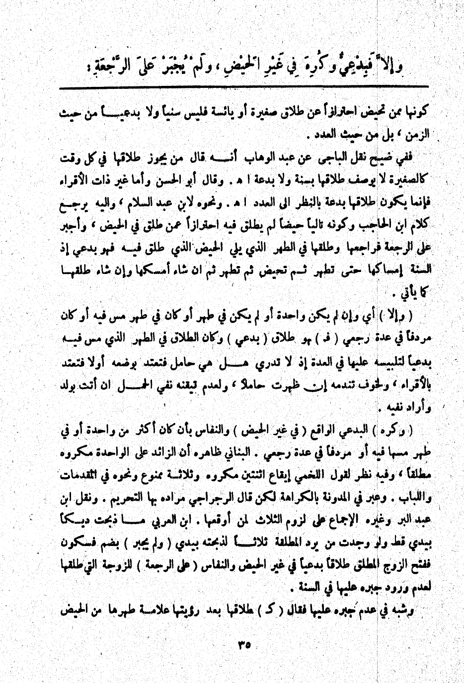 وَشَبَّهَ فِي عَدَمِ جَبْرِهِ عَلَيْهَا فَقَالَ (كَ) طَلَاقِهَا بَعْدَ رُؤْيَتِهَا عَلَامَةَ طُهْرِهَا مِنْ الْحَيْضِ