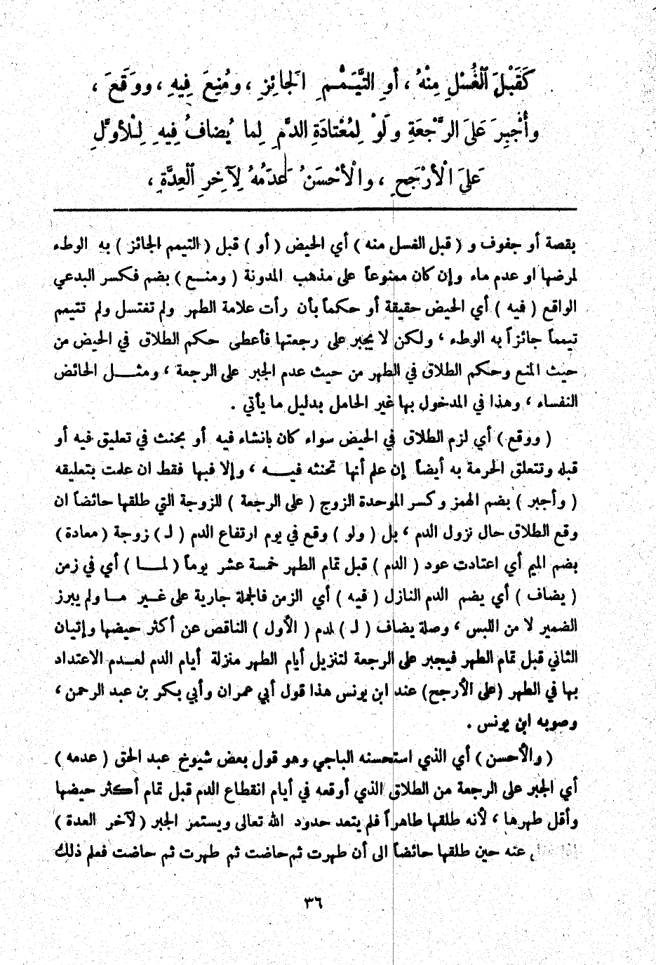 ـــــــــــــــــــــــــــــQبِقَصَّةٍ، أَوْ جُفُوفٍ وَ (قَبْلَ الْغُسْلِ مِنْهُ) أَيْ الْحَيْضِ (أَوْ) قَبْلَ (التَّيَمُّمِ الْجَائِزِ) بِهِ الْوَطْءُ لِمَرَضِهَا، أَوْ عَدَمِ مَاءٍ، وَإِنْ كَانَ مَمْنُوعًا عَلَى مَذْهَبِ الْمُدَوَّنَةِ (وَمُنِعَ) بِضَمٍّ فَكَسْرٍ الْبِدْعِيُّ الْوَاقِعُ (فِيهِ) أَيْ الْحَيْضِ حَقِيقَةً، أَوْ حُكْمًا بِأَنْ رَأَتْ عَلَامَةَ الطُّهْرِ وَلَمْ تَغْتَسِلْ وَلَمْ تَتَيَمَّمْ تَيَمُّمًا جَائِزًا بِهِ الْوَطْءُ، وَلَكِنْ لَا يُجْبَرُ عَلَى رَجْعَتِهَا فَأُعْطِيَ حُكْمَ الطَّلَاقِ فِي الْحَيْضِ مِنْ حَيْثُ الْمَنْعُ وَحُكْمَ الطَّلَاقِ فِي الطُّهْرِ مِنْ حَيْثُ عَدَمُ الْجَبْرِ عَلَى الرَّجْعَةِ، وَمِثْلُ الْحَائِضِ النُّفَسَاءُ، وَهَذَا فِي الْمَدْخُولِ بِهَا غَيْرِ الْحَامِلِ بِدَلِيلِ مَا يَأْتِي.