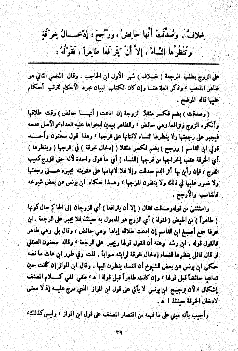 (وَصُدِّقَتْ) بِضَمٍّ فَكَسْرٍ مُثَقَّلًا الزَّوْجَةُ إنْ ادَّعَتْ (أَنَّهَا حَائِضٌ) وَقْتَ طَلَاقِهَا وَأَنْكَرَهُ الزَّوْجُ وَتَرَافَعَا وَهِيَ حَائِضٌ وَالظَّاهِرُ بِيَمِينٍ لِدَعْوَاهَا عَلَيْهِ الْعَدَاءَ وَالْأَصْلُ عَدَمُهُ فَيُجْبَرُ عَلَى رَجْعَتِهَا وَلَا يَنْظُرُهَا النِّسَاءُ لِائْتِمَانِهَا عَلَى فَرْجِهَا، وَهَذَا قَوْلُ سَحْنُونٍ وَأَحَدُ قَوْلَيْ ابْنِ الْقَاسِمِ (وَرُجِّحَ) بِضَمٍّ فَكَسْرٍ مُثَقَّلًا (إدْخَالُ خِرْقَةٍ) فِي فَرْجِهَا (وَيَنْظُرُهَا) أَيْ الْخِرْقَةَ عَقِبَ إخْرَاجِهَا مِنْ فَرْجِهَا (النِّسَاءُ) أَيْ مَا فَوْقَ وَاحِدَةٍ؛ لِأَنَّهُ حَقٌّ لِلزَّوْجِ كَعَيْبِ الْفَرْجِ، فَإِنْ رَأَيْنَ بِهَا أَثَرَ الدَّمِ صُدِّقَتْ، وَإِلَّا فَلَا لِاتِّهَامِهَا عَلَى عُقُوبَتِهِ بِجَبْرِهِ عَلَى رَجْعَتِهَا وَلَا ضَرَرَ عَلَيْهَا فِي ذَلِكَ وَلَا يَنْظُرْنَ لِفَرْجِهَا، وَهَذَا حَكَاهُ ابْنُ يُونُسَ عَنْ بَعْضِ شُيُوخِهِ فَالْمُنَاسِبُ وَالْأَرْجَحُ.