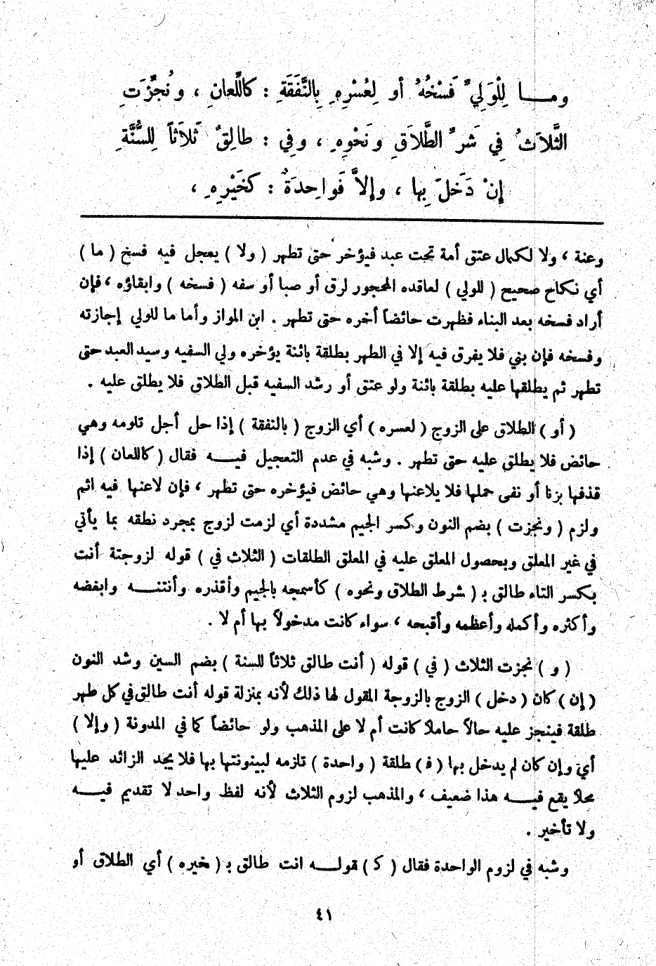 (وَلَا) يُعَجَّلُ فِيهِ فَسْخُ (مَا) أَيْ نِكَاحٍ صَحِيحٍ (لِلْوَلِيِّ) لِعَاقِدِهِ الْمَحْجُورِ لِرِقٍّ أَوْ صِبًا، أَوْ سَفَهٍ (فَسْخُهُ) وَإِبْقَاؤُهُ، فَإِنْ أَرَادَ فَسْخَهُ بَعْدَ الْبِنَاءِ فَظَهَرَتْ حَائِضًا أَخَّرَهُ حَتَّى تَطْهُرَ. ابْنُ الْمَوَّازِ، وَأَمَّا مَا لِلْوَلِيِّ إجَازَتُهُ وَفَسْخُهُ فَإِنْ بَنَى فَلَا يُفَرَّقُ فِيهِ إلَّا فِي الطُّهْرِ بِطَلْقَةٍ بَائِنَةٍ يُؤَخِّرُهُ وَلِيُّ السَّفِيهِ وَسَيِّدُ الْعَبْدِ حَتَّى تَطْهُرَ، ثُمَّ يُطَلِّقُهَا عَلَيْهِ بِطَلْقَةٍ بَائِنَةٍ وَلَوْ عَتَقَ، أَوْ رَشَدَ السَّفِيهُ قَبْلَ الطَّلَاقِ فَلَا يُطَلِّقُ عَلَيْهِ.