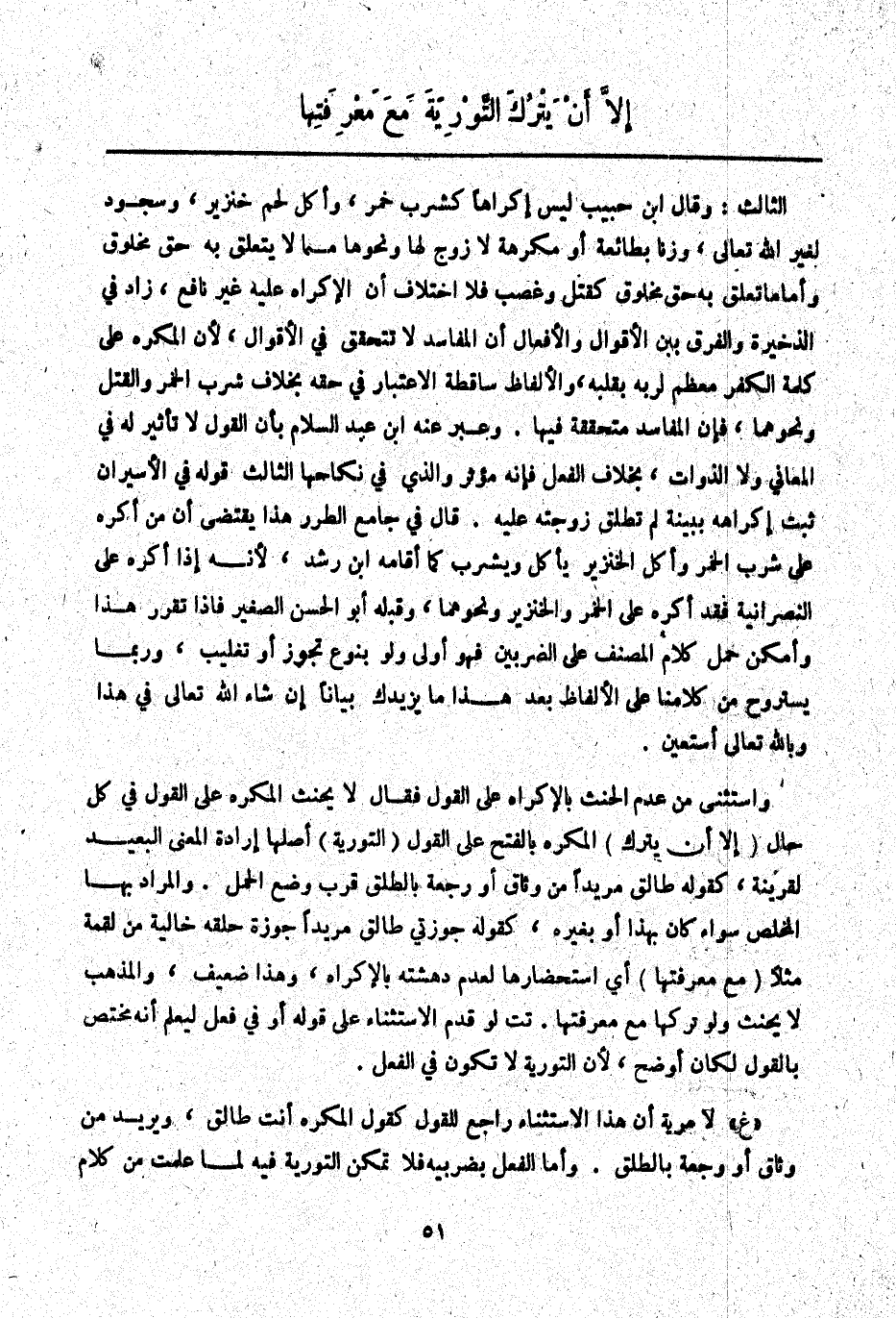 وَاسْتَثْنَى مِنْ عَدَمِ الْحِنْثِ بِالْإِكْرَاهِ عَلَى الْقَوْلِ فَقَالَ لَا يَحْنَثُ الْمُكْرَهُ عَلَى الْقَوْلِ فِي كُلِّ حَالٍ (إلَّا أَنْ يَتْرُكَ) الْمُكْرَهُ بِالْفَتْحِ عَلَى الْقَوْلِ (التَّوْرِيَةَ) أَصْلُهَا إرَادَةُ الْمَعْنَى الْبَعِيدِ لِقَرِينَةٍ، كَقَوْلِهِ طَالِقٌ مُرِيدًا مِنْ وِثَاقٍ أَوْ وَجَعٍ بِالطَّلْقِ قُرْبَ وَضْعِ الْحَمْلِ. وَالْمُرَادُ بِهَا الْمُخَلَّصُ سَوَاءٌ كَانَ بِهَذَا أَوْ بِغَيْرِهِ، كَقَوْلِهِ جَوْزَتِي طَالِقٌ مَرِيدًا: جَوْزَةَ حَلْقِهِ خَالِيَةً مِنْ لُقْمَةٍ مَثَلًا (مَعَ مَعْرِفَتِهَا) أَيْ اسْتِحْضَارِهَا لِعَدَمِ دَهْشَتِهِ بِالْإِكْرَاهِ، وَهَذَا ضَعِيفٌ وَالْمَذْهَبُ لَا يَحْنَثُ وَلَوْ تَرَكَهَا مَعَ مَعْرِفَتِهَا. تت لَوْ قَدَّمَ الِاسْتِثْنَاءَ عَلَى قَوْلِهِ أَوْ فِي فِعْلٍ لِيُعْلَمَ أَنَّهُ مُخْتَصٌّ بِالْقَوْلِ لَكَانَ أَوْضَحَ، لِأَنَّ التَّوْرِيَةَ لَا تَكُونُ فِي الْفِعْلِ.