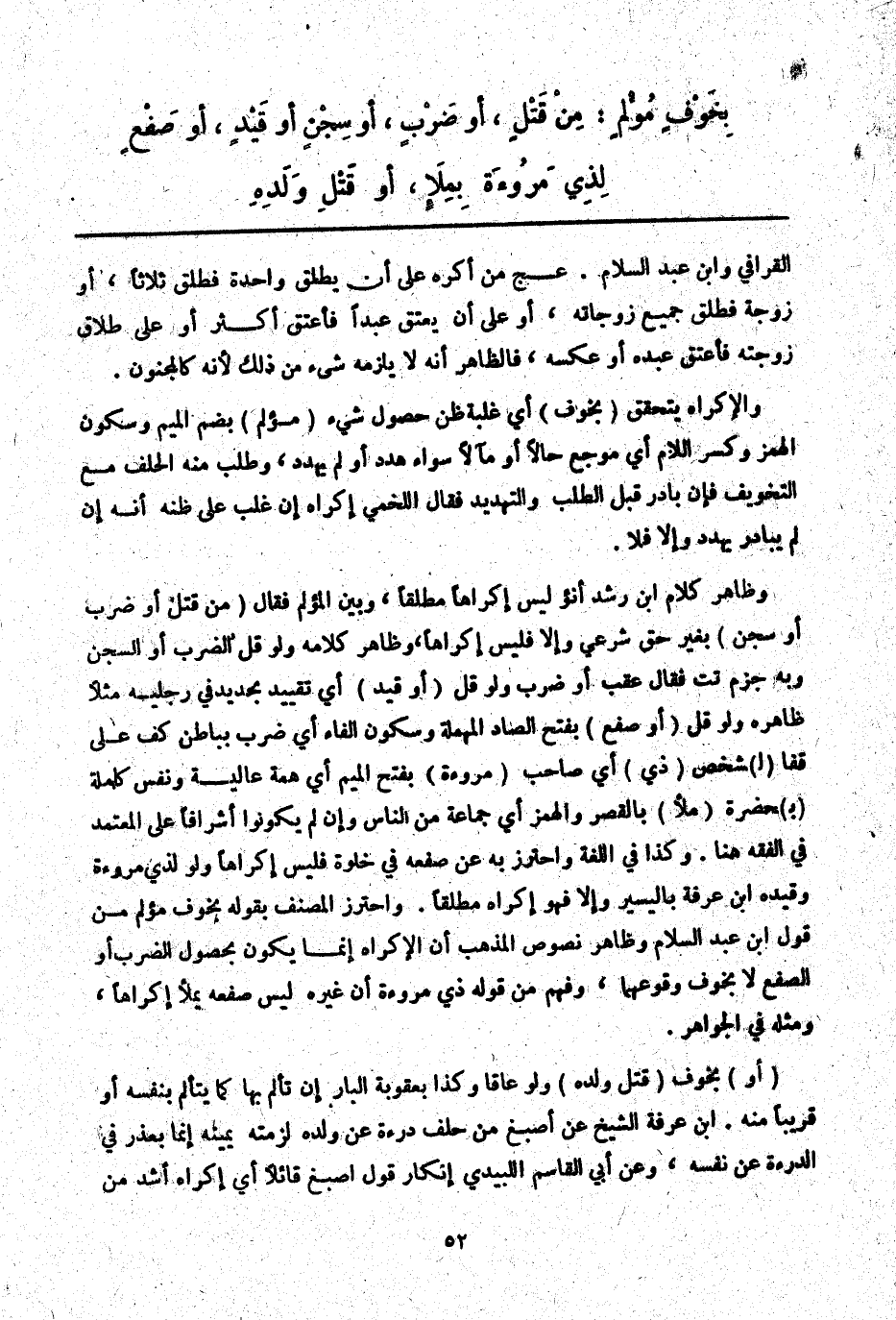 وَظَاهِرُ كَلَامِ ابْنِ رُشْدٍ أَنَّهُ لَيْسَ إكْرَاهًا مُطْلَقًا، وَبَيَّنَ الْمُؤْلِمَ فَقَالَ (مِنْ قَتْلٍ أَوْ ضَرْبٍ أَوْ سَجْنٍ) بِغَيْرِ حَقٍّ شَرْعِيٍّ وَإِلَّا فَلَيْسَ إكْرَاهًا، وَظَاهِرُ كَلَامِهِ وَلَوْ قَلَّ الضَّرْبُ أَوْ السَّجْنُ وَبِهِ جَزَمَ تت فَقَالَ عَقِبَ أَوْ ضَرْبٍ وَلَوْ قَالَ (أَوْ قَيْدٍ) أَيْ تَقْيِيدٍ بِحَدِيدٍ فِي رِجْلَيْهِ مَثَلًا ظَاهِرُهُ وَلَوْ قَلَّ (أَوْ صَفْعٍ) بِفَتْحِ الصَّادِ الْمُهْمَلَةِ وَسُكُونِ الْفَاءِ أَيْ ضَرْبٍ بِبَاطِنِ كَفٍّ عَلَى قَفًا (لِ) شَخْصٍ (ذِي) أَيْ صَاحِبِ (مُرُوءَةٍ) بِفَتْحِ الْمِيمِ أَيْ هِمَّةٍ عَالِيَةٍ وَنَفْسٍ كَامِلَةٍ (بِ) حَضْرَةِ (مَلَإٍ) بِالْقَصْرِ وَالْهَمْزِ أَيْ جَمَاعَةٍ مِنْ النَّاسِ وَإِنْ لَمْ يَكُونُوا أَشْرَافًا عَلَى الْمُعْتَمَدِ فِي الْفِقْهِ هُنَا. وَكَذَا فِي اللُّغَةِ وَاحْتَرَزَ بِهِ عَنْ صَفْعِهِ فِي خَلْوَةٍ فَلَيْسَ إكْرَاهًا وَلَوْ لِذِي مُرُوءَةٍ وَقَيَّدَهُ ابْنُ عَرَفَةَ بِالْيَسِيرِ وَإِلَّا فَهُوَ إكْرَاهٌ مُطْلَقًا. وَاحْتَرَزَ الْمُصَنِّفُ بِقَوْلِهِ بِخَوْفِ مُؤْلِمٍ مِنْ قَوْلِ ابْنِ عَبْدِ السَّلَامِ وَظَاهِرُ نُصُوصِ الْمَذْهَبِ أَنَّ الْإِكْرَاهَ إنَّمَا يَكُونُ بِحُصُولِ الضَّرْبِ أَوْ الصَّفْعِ لَا بِخَوْفِ وُقُوعِهِمَا، وَفُهِمَ مِنْ قَوْلِهِ ذِي مُرُوءَةٍ أَنَّ غَيْرَهُ لَيْسَ صَفْعُهُ بِمَلَإٍ إكْرَاهًا، وَمِثْلُهُ فِي الْجَوَاهِرِ.