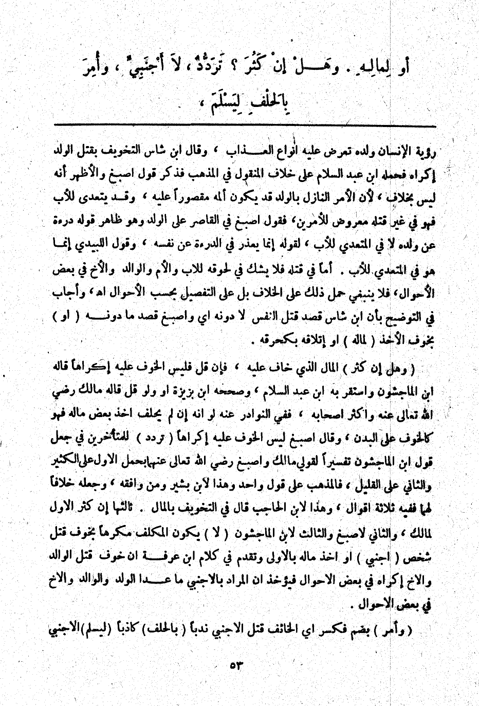 (وَهَلْ إنْ كَثُرَ) الْمَالُ الَّذِي خَافَ عَلَيْهِ فَإِنْ قَلَّ فَلَيْسَ الْخَوْفُ عَلَيْهِ إكْرَاهًا قَالَهُ ابْنُ الْمَاجِشُونِ وَاسْتَقَرَّ بِهِ ابْنُ عَبْدِ السَّلَامِ وَصَحَّحَهُ ابْنُ بَزِيزَةَ أَوْ وَلَوْ قَلَّ قَالَهُ مَالِكٌ - رَضِيَ اللَّهُ تَعَالَى عَنْهُ - وَأَكْثَرُ أَصْحَابِهِ، فَفِي النَّوَادِرِ عَنْهُ لَوْ أَنَّهُ إنْ لَمْ يَحْلِفْ أُخِذَ بَعْضُ مَالِهِ فَهُوَ كَالْخَوْفِ عَلَى الْبَدَنِ، وَقَالَ أَصْبَغُ لَيْسَ الْخَوْفُ عَلَيْهِ إكْرَاهًا (تَرَدُّدٌ) لِلْمُتَأَخِّرِينَ فِي جَعْلِ قَوْلِ ابْنِ الْمَاجِشُونِ تَفْسِيرًا لِقَوْلَيْ مَالِكٍ وَأَصْبَغَ - رَضِيَ اللَّهُ تَعَالَى عَنْهُمَا - بِحَمْلِ الْأَوَّلِ عَلَى الْكَثِيرِ وَالثَّانِي عَلَى الْقَلِيلِ، فَالْمَذْهَبُ عَلَى قَوْلٍ وَاحِدٍ وَهَذَا لِابْنِ بَشِيرٍ وَمَنْ وَافَقَهُ، وَجَعَلَهُ خِلَافًا لَهُمَا فَفِيهِ ثَلَاثَةُ أَقْوَالٍ، وَهَذَا لِابْنِ الْحَاجِبِ قَالَ فِي التَّخْوِيفِ بِالْمَالِ. ثَالِثُهَا إنْ كَثُرَ الْأَوَّلُ لِمَالِكٍ، وَالثَّانِي لِأَصْبَغَ وَالثَّالِثُ لِابْنِ الْمَاجِشُونِ