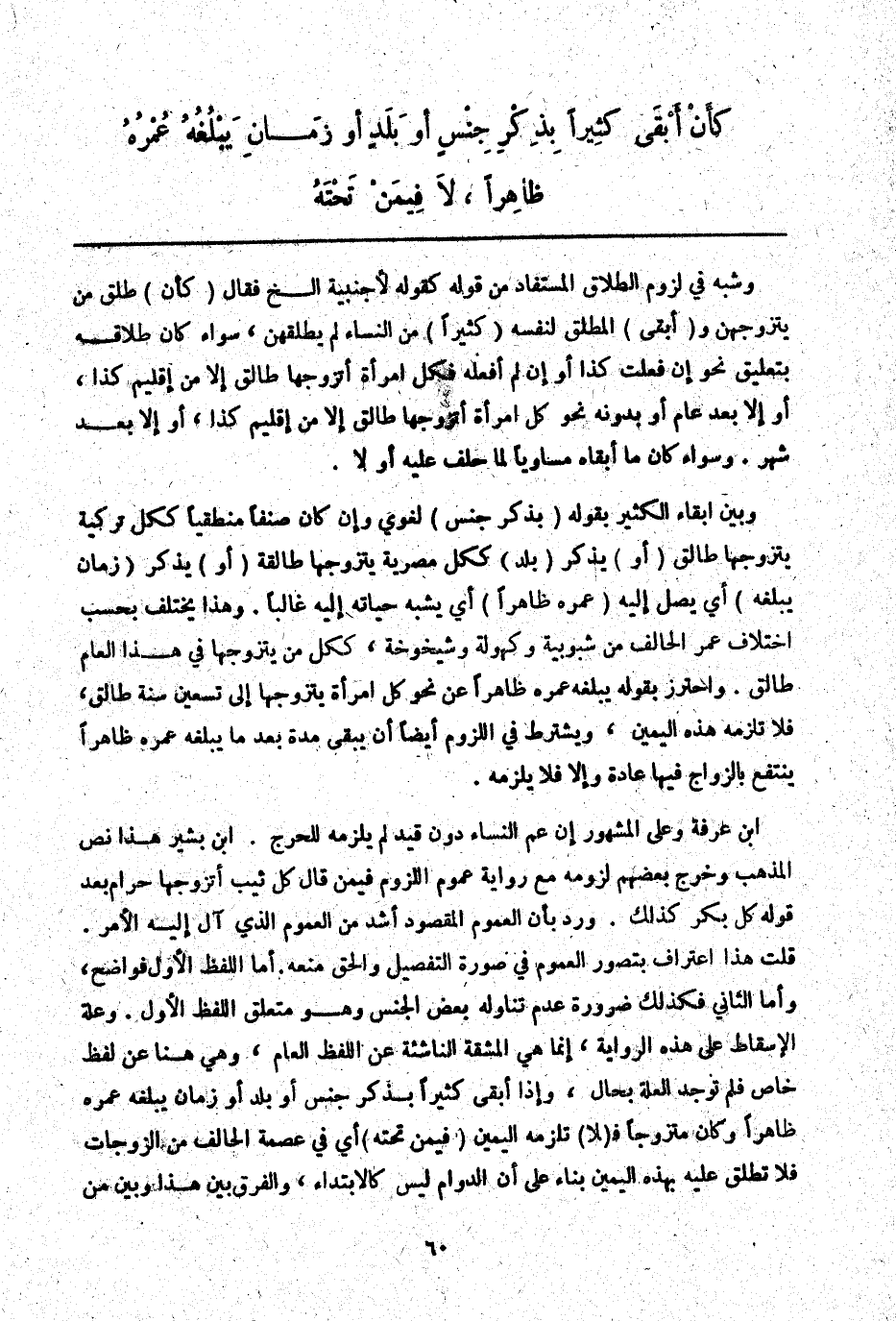 وَبَيْنَ إبْقَاءِ الْكَثِيرِ بِقَوْلِهِ (بِذِكْرِ جِنْسٍ) لُغَوِيٍّ وَإِنْ كَانَ صِنْفًا مَنْطِقِيًّا كَكُلِّ تُرْكِيَّةٍ يَتَزَوَّجُهَا طَالِقٌ (أَوْ) بِذِكْرِ (بَلَدٍ) كَكُلِّ مِصْرِيَّةٍ يَتَزَوَّجُهَا طَالِقَةٌ (أَوْ) بِذِكْرِ (زَمَانٍ يَبْلُغُهُ) أَيْ يَصِلُ إلَيْهِ (عُمُرُهُ ظَاهِرًا) أَيْ يُشْبِهُ حَيَاتَهُ إلَيْهِ غَالِبًا. وَهَذَا يَخْتَلِفُ بِحَسَبِ اخْتِلَافِ عُمُرِ الْحَالِفِ مِنْ شُبُوبِيَّةٍ وَكُهُولَةٍ وَشَيْخُوخَةٍ، كَكُلِّ مَنْ يَتَزَوَّجُهَا فِي هَذَا الْعَامِ طَالِقٌ. وَاحْتَرَزَ بِقَوْلِهِ يَبْلُغُهُ عُمُرُهُ ظَاهِرًا عَنْ نَحْوِ كُلِّ امْرَأَةٍ يَتَزَوَّجُهَا إلَى تِسْعِينَ سَنَةً طَالِقٌ، فَلَا تَلْزَمُهُ هَذِهِ الْيَمِينُ، وَيُشْتَرَطُ فِي اللُّزُومِ أَيْضًا أَنْ يَبْقَى مُدَّةً بَعْدَ مَا يَبْلُغُهُ عُمُرُهُ ظَاهِرًا يُنْتَفَعُ بِالزَّوَاجِ فِيهَا عَادَةً وَإِلَّا فَلَا يَلْزَمُهُ.