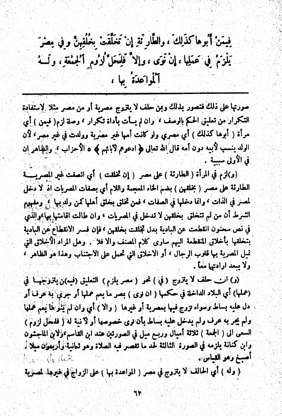 (وَ) إنْ حَلَفَ لَا يَتَزَوَّجُ (فِي) نَحْوِ (مِصْرَ يَلْزَمُ) التَّعْلِيقُ (فِيمَنْ) يَتَزَوَّجُهَا فِي (عَمَلِهَا) أَيْ الْبِلَادِ الدَّاخِلَةِ فِي حُكْمِهَا (إنْ نَوَى) بِمِصْرَ مَا يَعُمُّ عَمَلَهَا أَوْ جَرَى بِهِ عُرْفٌ أَوْ دَلَّ عَلَيْهِ بِسَاطٌ وَسَوَاءٌ تَزَوَّجَ فِيهَا بِمِصْرِيَّةٍ أَوْ غَيْرِهَا (وَإِلَّا) أَيْ وَإِنْ لَمْ يَنْوِ مَا يَعُمُّ عَمَلَهَا وَلَمْ يَجْرِ بِهِ عُرْفٌ وَلَمْ يَدْخُلْ عَلَيْهِ بِسَاطٌ بِأَنْ نَوَى خُصُوصَهَا أَوْ لِآنِيَةٍ لَهُ (فَلِمَحَلِّ لُزُومِ) السَّعْيِ إلَى (الْجُمُعَةِ) ثَلَاثَةُ أَمْيَالٍ وَرُبُعُ مِيلٍ فِي الصُّورَتَيْنِ عِنْدَ ابْنِ الْقَاسِمِ وَلِابْنِ الْمَاجِشُونِ وَابْنِ كِنَانَةَ يَلْزَمُهُ فِي الصُّورَةِ الثَّالِثَةِ لِحَدِّ مَا تُقْصَرُ فِيهِ الصَّلَاةُ وَهُوَ ثَمَانِيَةٌ وَأَرْبَعُونَ مِيلًا. أَصْبَغُ وَهُوَ الْقِيَاسُ.