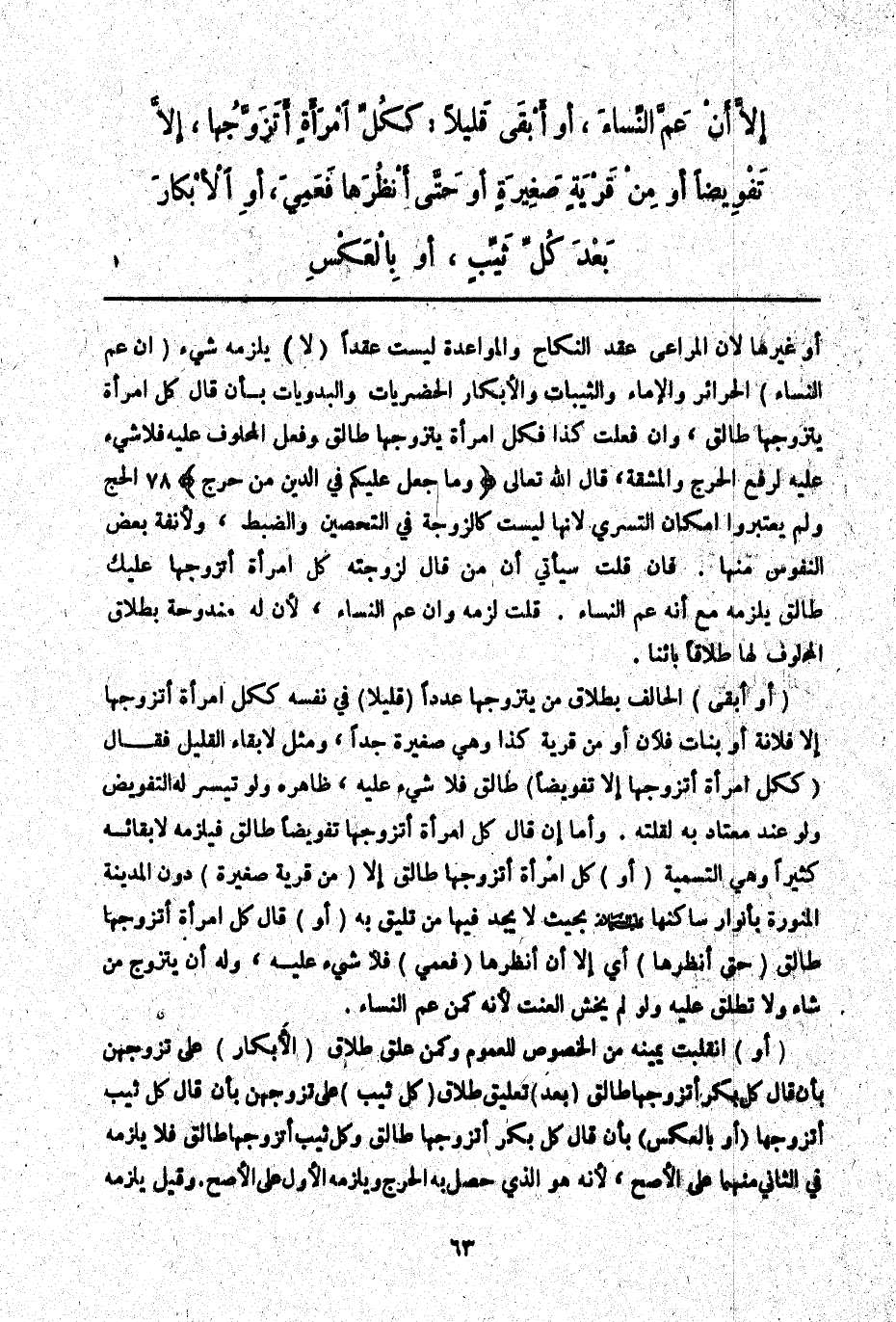 أَوْ أَبْقَى قَلِيلًا: كَكُلُّ امْرَأَةٍ أَتَزَوَّجُهَا، إلَّا تَفْوِيضًا أَوْ مِنْ قَرْيَةٍ صَغِيرَةٍ أَوْ حَتَّى أَنْظُرَهَا فَعَمِيَ