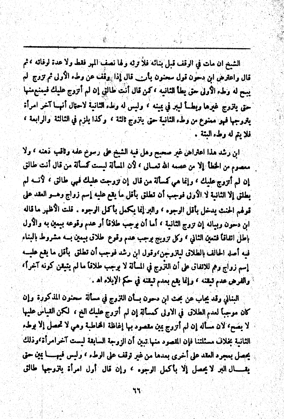 ابْنُ رُشْدٍ هَذَا اعْتِرَاضٌ غَيْرُ صَحِيحٍ وَهَلْ فِيهِ الشَّيْخُ عَلَى رُسُوخِ عِلْمِهِ وَثَاقِبِ ذِهْنِهِ، وَلَا مَعْصُومَ مِنْ الْخَطَإِ إلَّا مَنْ عَصَمَهُ اللَّهُ تَعَالَى، لِأَنَّ الْمَسْأَلَةَ لَيْسَتْ كَمَسْأَلَةِ مَنْ قَالَ أَنْتِ طَالِقٌ إنْ لَمْ أَتَزَوَّجْ عَلَيْك، وَإِنَّمَا هِيَ كَمَسْأَلَةِ مَنْ قَالَ إنْ تَزَوَّجْت عَلَيْك فَهِيَ طَالِقٌ لِأَنَّهُ لَمْ يُطَلِّقْ إلَّا الثَّانِيَةَ لَا الْأُولَى فَوَجَبَ أَنْ تَطْلُقَ بِأَقَلَّ مَا يَقَعُ عَلَى اسْمِ زَوَاجٍ وَهُوَ الْعَقْدُ عَلَى قَوْلِهِمْ الْحِنْثُ يَدْخُلُ بِأَقَلِّ الْوُجُوهِ، وَالْبِرُّ إنَّمَا يَكْمُلُ بِأَكْمَلِ الْوُجُوهِ. قُلْت الْأَظْهَرُ مَا قَالَهُ ابْنُ دَحُونٍ وَبَيَانُهُ إنْ تَزَوَّجَ الثَّانِيَةَ، أَمَّا أَنْ يُوجِبَ طَلَاقًا أَوْ عَدَمَ وُقُوعِهِ بِيَمِينٍ بِهِ وَالْأَوَّلُ بَاطِلٌ اتِّفَاقًا فَتَعَيَّنَ الثَّانِي، وَكُلُّ تَزْوِيجٍ يُوجِبُ عَدَمَ وُقُوعِ طَلَاقٍ بِيَمِينٍ بِهِ مَشْرُوطٌ بِالْبِنَاءِ فِيهِ أَصْلُهُ الْحَالِفُ بِالطَّلَاقِ لَيَتَزَوَّجَنَّ، وَقَوْلُ ابْنِ رُشْدٍ فَوَجَبَ أَنْ تَطْلُقَ بِأَقَلِّ مَا يَقَعُ عَلَيْهِ اسْمُ زَوَاجٍ وَهْمٌ لِلِاتِّفَاقِ عَلَى أَنَّ التَّزَوُّجَ فِي الْمَسْأَلَةِ لَا يُوجِبُ طَلَاقًا مَا لَمْ يُتَيَقَّنْ كَوْنُهُ آخِرًا، وَالْفَرْضُ عَدَمُ تَيَقُّنِهِ، وَإِنَّمَا يَقَعُ بِعَدَمِ تَيَقُّنِهِ فِي حُكْمِ الْإِيلَاءِ اهـ.