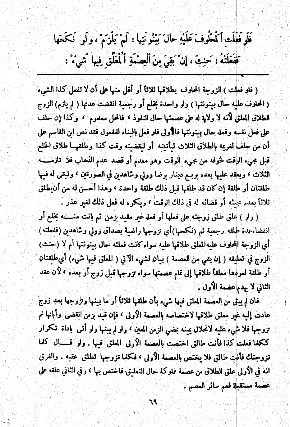 ـــــــــــــــــــــــــــــQفَلَوْ فَعَلَتْ) الزَّوْجَةُ الْمَحْلُوفَ بِطَلَاقِهَا ثَلَاثًا أَوْ أَقَلَّ مِنْهَا عَلَى أَنْ لَا تَفْعَلَ كَذَا الشَّيْءَ (الْمَحْلُوفَ عَلَيْهِ حَالَ بَيْنُونَتِهَا) وَلَوْ وَاحِدَةً بِخُلْعٍ أَوْ رَجْعِيَّةً انْقَضَتْ عِدَّتُهَا (لَمْ يَلْزَمْ) الزَّوْجَ الطَّلَاقُ الْمُعَلَّقُ لِأَنَّهُ لَا وِلَايَةَ لَهُ عَلَى عِصْمَتِهَا حَالَ النُّفُوذِ، فَالْمَحَلُّ مَعْدُومٌ وَكَذَا إنْ حَلَفَ عَلَى فِعْلِ نَفْسِهِ وَفَعَلَهُ حَالَ بَيْنُونَتِهَا فَالْأَوْلَى فَلَوْ فُعِلَ بِالْبِنَاءِ لِلْمَفْعُولِ فَقَدْ نَصَّ ابْنُ الْقَاسِمِ عَلَى أَنَّ مَنْ حَلَفَ لِغَرِيمِهِ بِالطَّلَاقِ الثَّلَاثِ لَيَأْتِيَنَّهُ أَوْ لَيَقْضِيَنَّهُ وَقْتَ كَذَا وَطَلَّقَهَا طَلَاقَ الْخُلْعِ قَبْلَ مَجِيءِ الْوَقْتِ لِخَوْفِهِ مِنْ مَجِيءِ الْوَقْتِ وَهُوَ مُعْدِمٌ أَوْ قَصَدَ عَدَمَ الذَّهَابِ فَلَمْ تَلْزَمْهُ الثَّلَاثِ، وَيَعْقِدُ عَلَيْهَا بَعْدَهُ بِرُبُعِ دِينَارٍ بِرِضًا وَوَلِيٍّ وَشَاهِدَيْنِ فِي الصُّورَتَيْنِ، وَتَبْقَى لَهُ فِيهَا طَلْقَتَانِ أَوْ طَلْقَةٌ إنْ كَانَ قَدْ طَلَّقَهَا قَبْلَ ذَلِكَ طَلْقَةً وَاحِدَةً، وَهَذَا أَحْسَنُ لَهُ مِنْ أَنْ يُطَلِّقَ ثَلَاثًا بِعَدَمِ مَجِيئِهِ أَوْ قَضَائِهِ لَهُ فِي ذَلِكَ الْوَقْتِ، وَيُكْرَهُ لَهُ فِعْلُ ذَلِكَ لِغَيْرِ عُذْرٍ.