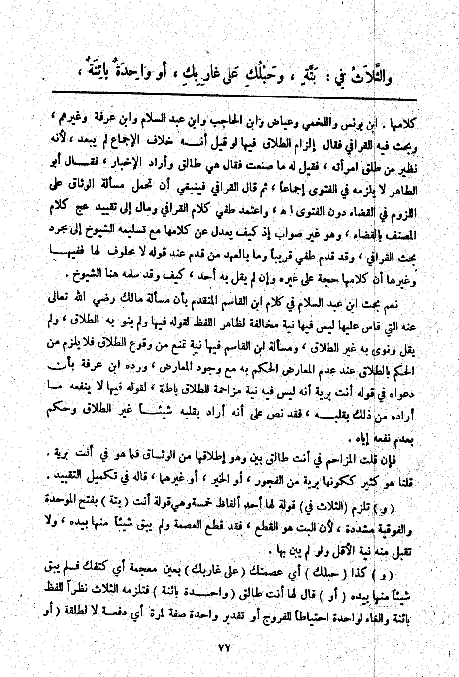 نَعَمْ بَحَثَ ابْنُ عَبْدِ السَّلَامِ فِي كَلَامِ ابْنِ الْقَاسِمِ الْمُتَقَدِّمِ بِأَنَّ مَسْأَلَةَ مَالِكٍ - رَضِيَ اللَّهُ تَعَالَى عَنْهُ - الَّتِي قَاسَ عَلَيْهَا لَيْسَ فِيهَا نِيَّةُ مُخَالَفَةٍ لِظَاهِرِ اللَّفْظِ لِقَوْلِهِ فِيهَا وَلَمْ يَنْوِ بِهِ الطَّلَاقَ، وَلَمْ يَقُلْ وَنَوَى بِهِ غَيْرَ الطَّلَاقِ، وَمَسْأَلَةُ ابْنِ الْقَاسِمِ فِيهَا نِيَّةٌ تَمْنَعُ مِنْ وُقُوعِ الطَّلَاقِ فَلَا يَلْزَمُ مِنْ الْحُكْمِ بِالطَّلَاقِ عِنْدَ عَدَمِ الْمُعَارِضِ الْحُكْمُ بِهِ مَعَ وُجُودِ الْمُعَارِضِ، وَرَدَّهُ ابْنُ عَرَفَةَ بِأَنَّ دَعْوَاهُ فِي قَوْلِهِ أَنْتِ بَرِيَّةٌ أَنَّهُ لَيْسَ فِيهِ نِيَّةٌ مُزَاحِمَةٌ لِلطَّلَاقِ بَاطِلَةٌ، لِقَوْلِهِ فِيهَا لَا يَنْفَعُهُ مَا أَرَادَهُ مِنْ ذَلِكَ بِقَلْبِهِ، فَقَدْ نَصَّ عَلَى أَنَّهُ أَرَادَ بِقَلْبِهِ شَيْئًا غَيْرَ الطَّلَاقِ وَحَكَمَ بِعَدَمِ نَفْعِهِ إيَّاهُ.