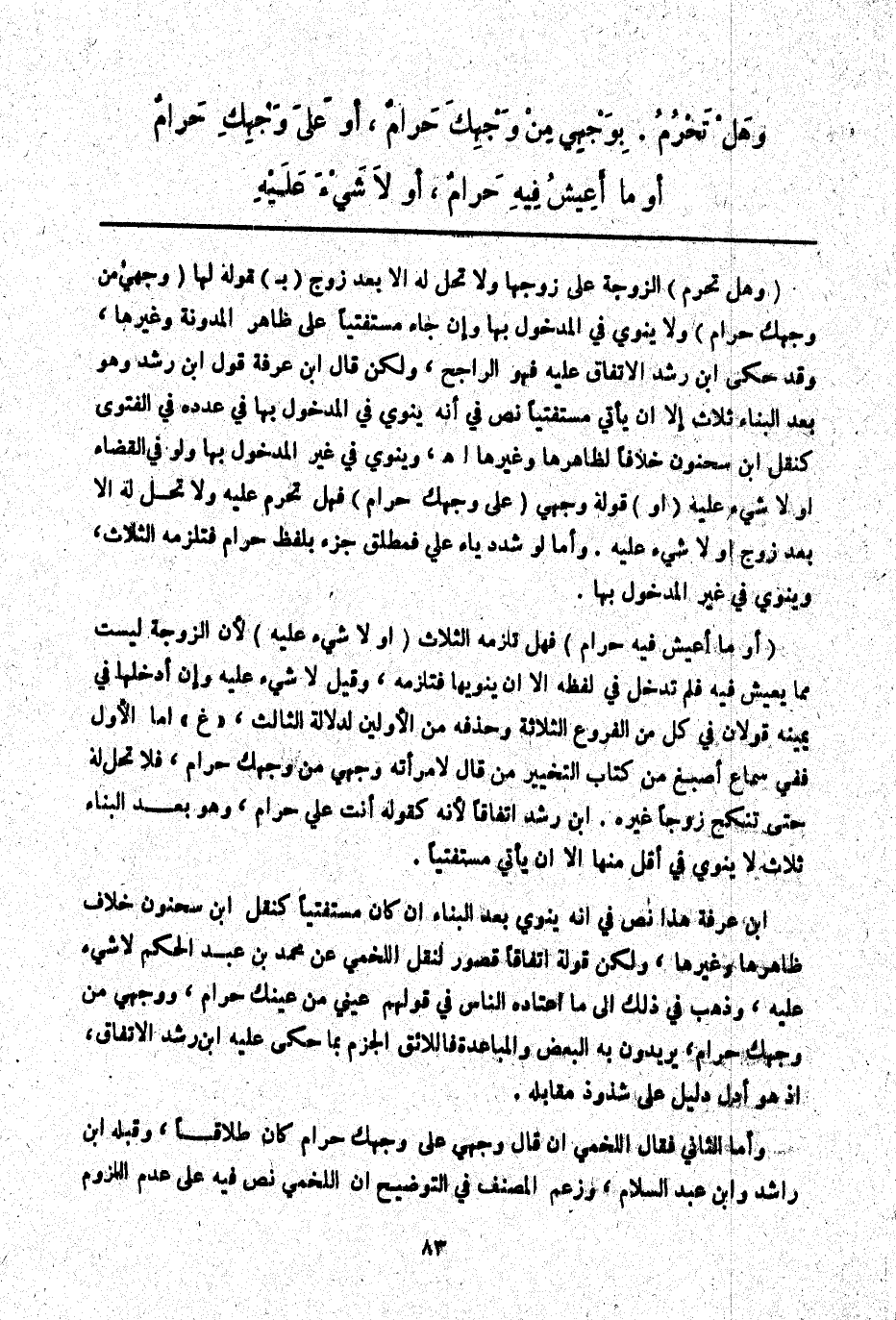 ـــــــــــــــــــــــــــــQ (وَهَلْ تَحْرُمُ) الزَّوْجَةُ عَلَى زَوْجِهَا وَلَا تَحِلُّ لَهُ إلَّا بَعْدَ زَوْجٍ (بِ) قَوْلِهِ لَهَا (وَجْهِي مِنْ وَجْهِك حَرَامٌ) وَلَا يَنْوِي فِي الْمَدْخُولَ بِهَا وَإِنْ جَاءَ مُسْتَفْتِيًا عَلَى ظَاهِرِ الْمُدَوَّنَةِ وَغَيْرِهَا، وَقَدْ حَكَى ابْنُ رُشْدٍ الِاتِّفَاقَ عَلَيْهِ فَهُوَ الرَّاجِحُ، وَلَكِنْ قَالَ ابْنُ عَرَفَةَ قَوْلَ ابْنِ رُشْدٍ وَهُوَ بَعْدَ الْبِنَاءِ ثَلَاثٌ إلَّا أَنْ يَأْتِيَ مُسْتَفْتِيًا نَصَّ فِي أَنَّهُ يَنْوِي فِي الْمَدْخُولِ بِهَا فِي عَدَدِهِ فِي الْفَتْوَى كَنَقْلِ ابْنِ سَحْنُونٍ خِلَافًا لِظَاهِرِهَا وَغَيْرِهَا. اهـ. وَيَنْوِي فِي غَيْرِ الْمَدْخُولِ بِهَا وَلَوْ فِي الْقَضَاءِ أَوْ لَا شَيْءَ عَلَيْهِ (أَوْ) قَوْلُهُ وَجْهِي (عَلَى وَجْهِك حَرَامٌ) فَهَلْ تَحْرُمُ عَلَيْهِ وَلَا تَحِلُّ لَهُ إلَّا بَعْدَ زَوْجٍ أَوْ لَا شَيْءَ عَلَيْهِ. وَأَمَّا لَوْ شَدَّدَ يَاءَ عَلَيَّ فَمُطْلَقُ جُزْءٍ بِلَفْظٍ حَرَامٍ فَتَلْزَمُهُ الثَّلَاثُ، وَيَنْوِي فِي غَيْرِ الْمَدْخُولِ بِهَا.