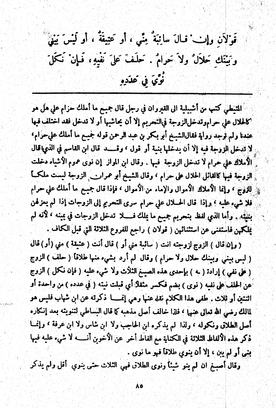 ـــــــــــــــــــــــــــــQالْمُتَيْطِيِّ كَتَبَ مِنْ إشْبِيلِيَّةَ إلَى الْقَيْرَوَانِ فِي رَجُلٍ قَالَ جَمِيعُ مَا أَمْلِكُ حَرَامٌ عَلَيَّ هَلْ هُوَ كَالْحَلَالِ عَلَيَّ حَرَامٌ وَتَدْخُلُ الزَّوْجَةُ فِي التَّحْرِيمِ إلَّا أَنْ يُحَاشِيَهَا أَوْ لَا تَدْخُلُ فَقَدْ اُخْتُلِفَ فِيهَا عِنْدَنَا وَلَمْ تُوجَدْ رِوَايَةٌ فَقَالَ الشَّيْخُ أَبُو بَكْرِ بْنُ عَبْدِ الرَّحْمَنِ قَوْلُهُ جَمِيعُ مَا أَمْلِكُ عَلَيَّ حَرَامٌ، لَا تَدْخُلُ الزَّوْجَةُ فِيهِ إلَّا أَنْ يُدْخِلَهَا بِنِيَّةٍ أَوْ قَوْلٍ، وَقَدْ قَالَ ابْنُ الْقَاسِمِ فِي الَّذِي قَالَ الْأَمْلَاكُ عَلَيَّ حَرَامٌ لَا تَدْخُلُ الزَّوْجَةُ فِيهَا. وَقَالَ ابْنُ الْمَوَّازِ إنْ نَوَى عُمُومَ الْأَشْيَاءِ دَخَلَتْ الزَّوْجَةُ فِيهَا كَالْقَائِلِ الْحَلَالُ عَلَيَّ حَرَامٌ، وَقَالَ الشَّيْخُ أَبُو عِمْرَانَ: الزَّوْجَةُ لَيْسَتْ مِلْكًا لِلزَّوْجِ، وَإِنَّمَا الْأَمْلَاكُ الْأَمْوَالُ وَالْإِمَاءُ مِنْ الْأَمْوَالِ، فَإِذَا قَالَ جَمِيعُ مَا أَمْلِكُ عَلَيَّ حَرَامٌ فَلَا شَيْءَ عَلَيْهِ، وَإِذَا قَالَ الْحَلَالُ عَلَيَّ حَرَامٌ سَرَى التَّحْرِيمُ إلَى الزَّوْجَاتِ إذَا لَمْ يَعْزِلْهُنَّ بِنِيَّتِهِ. وَأَمَّا الَّذِي لَفَظَ بِتَحْرِيمِ جَمِيعِ مَا يَمْلِكُ فَلَا تَدْخُلُ الزَّوْجَاتُ فِي يَمِينِهِ لِأَنَّهُ لَمْ يَمْلِكْهُنَّ فَاسْتَغْنَى عَنْ اسْتِثْنَائِهِنَّ (قَوْلَانِ) رَاجِعٌ لِلْفُرُوعِ الثَّلَاثَةِ الَّتِي قَبْلَ الْكَافِ.