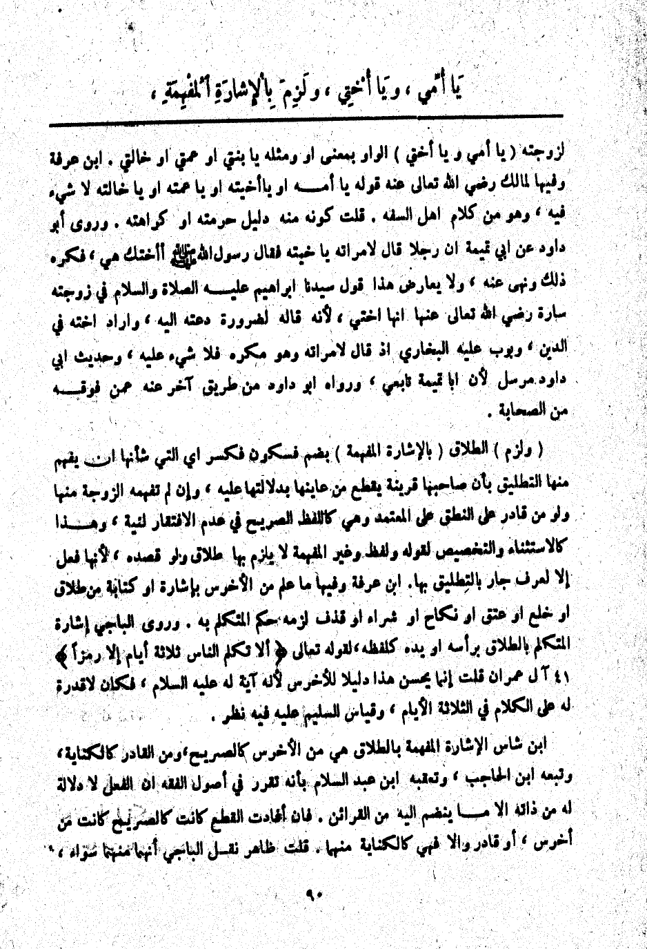 ـــــــــــــــــــــــــــــQلِزَوْجَتِهِ (يَا أُمِّي وَيَا أُخْتِي) الْوَاوُ بِمَعْنَى أَوْ وَمِثْلُهُ يَا بُنَيَّتِي أَوْ عَمَّتِي أَوْ خَالَتِي. ابْنُ عَرَفَةَ وَفِيهَا لِمَالِكٍ - رَضِيَ اللَّهُ تَعَالَى عَنْهُ - قَوْلُهُ يَا أُمَّهُ أَوْ يَا أُخَيَّتَهُ أَوْ يَا عَمَّتَهُ أَوْ يَا خَالَتَهُ لَا شَيْءَ فِيهِ، وَهُوَ مِنْ كَلَامِ أَهْلِ السَّفَهِ. قُلْت كَوْنُهُ مِنْهُ دَلِيلُ حُرْمَتِهِ أَوْ كَرَاهَتِهِ. وَرَوَى أَبُو دَاوُد عَنْ أَبِي تَمِيمَةَ «أَنَّ رَجُلًا قَالَ لِامْرَأَتِهِ يَا أُخَيَّةُ فَقَالَ رَسُولُ اللَّهِ - صَلَّى اللَّهُ عَلَيْهِ وَسَلَّمَ - أَأُخْتُك هِيَ، فَكَرِهَ ذَلِكَ وَنَهَى عَنْهُ» ، وَلَا يُعَارِضُ هَذَا قَوْلُ سَيِّدِنَا إبْرَاهِيمَ - عَلَيْهِ الصَّلَاةُ وَالسَّلَامُ - فِي زَوْجَتِهِ سَارَةَ - رَضِيَ اللَّهُ تَعَالَى عَنْهَا - إنَّهَا أُخْتِي لِأَنَّهُ قَالَهُ لِضَرُورَةٍ دَعَتْهُ إلَيْهِ، وَأَرَادَ أُخْتَهُ فِي الدِّينِ، وَبَوَّبَ عَلَيْهِ الْبُخَارِيُّ إذْ قَالَ لِامْرَأَتِهِ وَهُوَ مُكْرَهٌ فَلَا شَيْءَ عَلَيْهِ وَحَدِيثُ أَبِي دَاوُد مُرْسَلٌ لِأَنَّ أَبَا تَمِيمَةَ تَابِعِيٌّ، وَرَوَاهُ أَبُو دَاوُد مِنْ طَرِيقٍ آخَرَ عَنْهُ عَمَّنْ فَوْقَهُ مِنْ الصَّحَابَةِ.