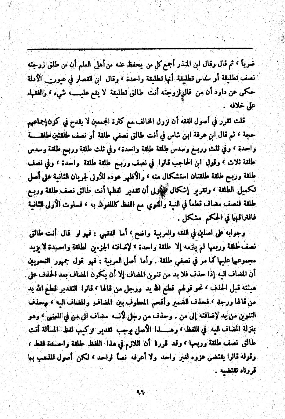 ـــــــــــــــــــــــــــــQضَرْبًا، ثُمَّ قَالَ وَقَالَ ابْنُ الْمُنْذِرِ أَجْمَعَ كُلُّ مَنْ يُحْفَظُ عَنْهُ مِنْ أَهْلِ الْعِلْمِ أَنَّ مَنْ طَلَّقَ زَوْجَتَهُ نِصْفَ تَطْلِيقَةٍ أَوْ سُدُسَ تَطْلِيقَةٍ أَنَّهَا تَطْلِيقَةٌ وَاحِدَةٌ، وَقَالَ ابْنُ الْقَصَّارِ فِي عُيُونِ الْأَدِلَّةِ حُكِيَ عَنْ دَاوُد أَنَّ مَنْ قَالَ لِزَوْجَتِهِ أَنْتِ طَالِقٌ تَطْلِيقَةً لَا يَقَعُ عَلَيْهِ شَيْءٌ، وَالْفُقَهَاءُ عَلَى خِلَافِهِ.