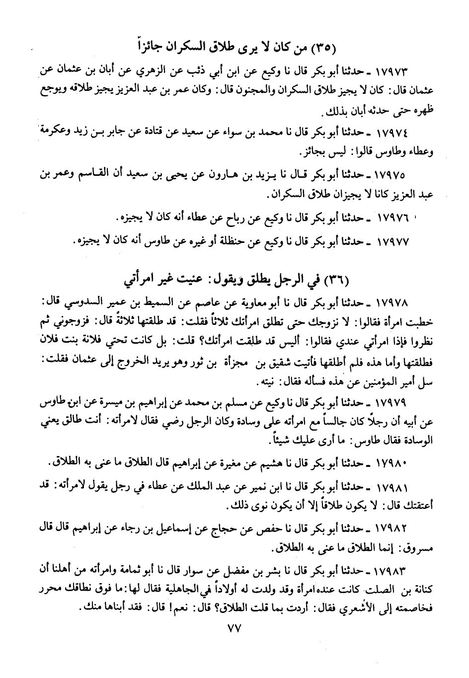 17973 - حَدَّثَنَا أَبُو بَكْرٍ قَالَ: نا وَكِيعٌ، عَنِ ابْنِ أَبِي ذِئْبٍ، عَنِ الزُّهْرِيِّ، عَنْ أَبَانَ بْنِ عُثْمَانَ، عَنْ عُثْمَانَ، قَالَ: «§كَانَ لَا يُجِيزُ طَلَاقَ السَّكْرَانِ، وَالْمَجْنُونِ» قَالَ: «وَكَانَ عُمَرُ بْنُ عَبْدِ الْعَزِيزِ يُجِيزُ طَلَاقَهُ، وَيُوجِعُ ظَهْرَهُ»، حَتَّى حَدَّثَنَا أَبَانُ بِذَلِكَ