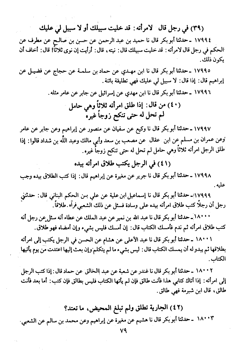 17997 - حَدَّثَنَا أَبُو بَكْرٍ قَالَ: نا وَكِيعٌ، عَنْ سُفْيَانَ، عَنْ مَنْصُورٍ، عَنْ إِبْرَاهِيمَ، وَعَنْ جَابِرٍ، عَنْ عَامِرٍ، وَعَنْ عِمْرَانَ بْنِ مُسْلِمٍ، عَنِ ابْنِ عَفَّانَ، عَنْ مُصْعَبِ بْنِ سَعْدٍ، وَأَبِي مَالِكٍ، وَعَبْدِ اللَّهِ بْنِ شَدَّادٍ قَالُوا: «§إِذَا طَلَّقَ الرَّجُلُ امْرَأَتَهُ ثَلَاثًا، وَهِيَ حَامِلٌ لَمْ تَحِلَّ لَهُ، حَتَّى تَنْكِحَ زَوْجًا غَيْرَهُ»
