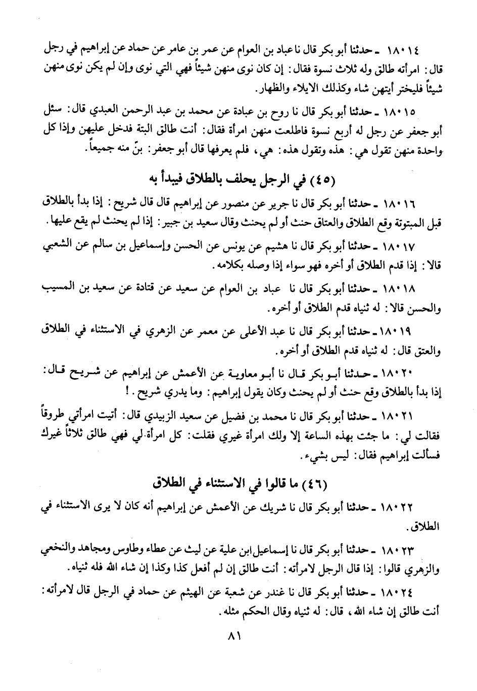 18022 - حَدَّثَنَا أَبُو بَكْرٍ قَالَ: نا شَرِيكٌ، عَنِ الْأَعْمَشِ، عَنْ إِبْرَاهِيمَ، أَنَّهُ كَانَ «§لَا يَرَى الِاسْتِثْنَاءَ فِي الطَّلَاقِ»