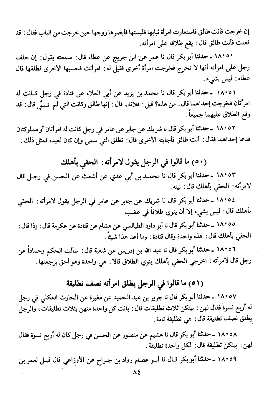 18059 - حَدَّثَنَا أَبُو بَكْرٍ قَالَ: نا أَبُو عِصَامٍ رَوَّادُ بْنُ جَرَّاحٍ، عَنِ الْأَوْزَاعِيِّ، قَالَ: قِيلَ لِعُمَرَ بْنِ عَبْدِ الْعَزِيزِ: الرَّجُلُ يُطَلِّقُ امْرَأَتَهُ نِصْفَ تَطْلِيقَةٍ، قَالَ: «§هِيَ تَطْلِيقَةٌ»