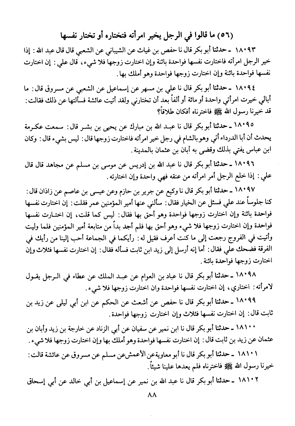18093 - حَدَّثَنَا أَبُو بَكْرٍ قَالَ: نا حَفْصُ بْنُ غِيَاثٍ، عَنِ الشَّيْبَانِيِّ، عَنِ الشَّعْبِيِّ، قَالَ: قَالَ عَبْدُ اللَّهِ: «§إِذَا خَيَّرَ الرَّجُلُ امْرَأَتَهُ فَاخْتَارَتْ نَفْسَهَا فَوَاحِدَةٌ بَائِنَةٌ، وَإِنِ اخْتَارَتْ زَوْجَهَا فَلَا شَيْءَ»، قَالَ عَلِيٌّ: «إِنِ اخْتَارَتْ نَفْسَهَا فَوَاحِدَةٌ بَائِنَةٌ، وَإِنِ اخْتَارَتْ زَوْجَهَا فَوَاحِدَةٌ وَهُوَ أَمْلَكُ بِهَا»