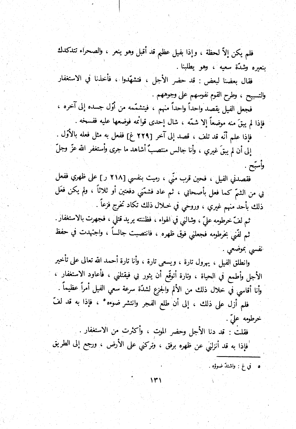 وَانْطَلق الْفِيل، يُهَرْوِل تَارَة، وَيسْعَى تَارَة، وَأَنا تَارَة أَحْمد الله تَعَالَى على تَأْخِير الْأَجَل وأطمع فِي الْحَيَاة، وَتارَة أتوقع أَن يثور بِي فَيَقْتُلنِي، فأعاود الاسْتِغْفَار، وَأَنا أقاسي فِي خلال ذَلِك من الْأَلَم والجزع لشدَّة سرعَة سعي الْفِيل أمرا عَظِيما.