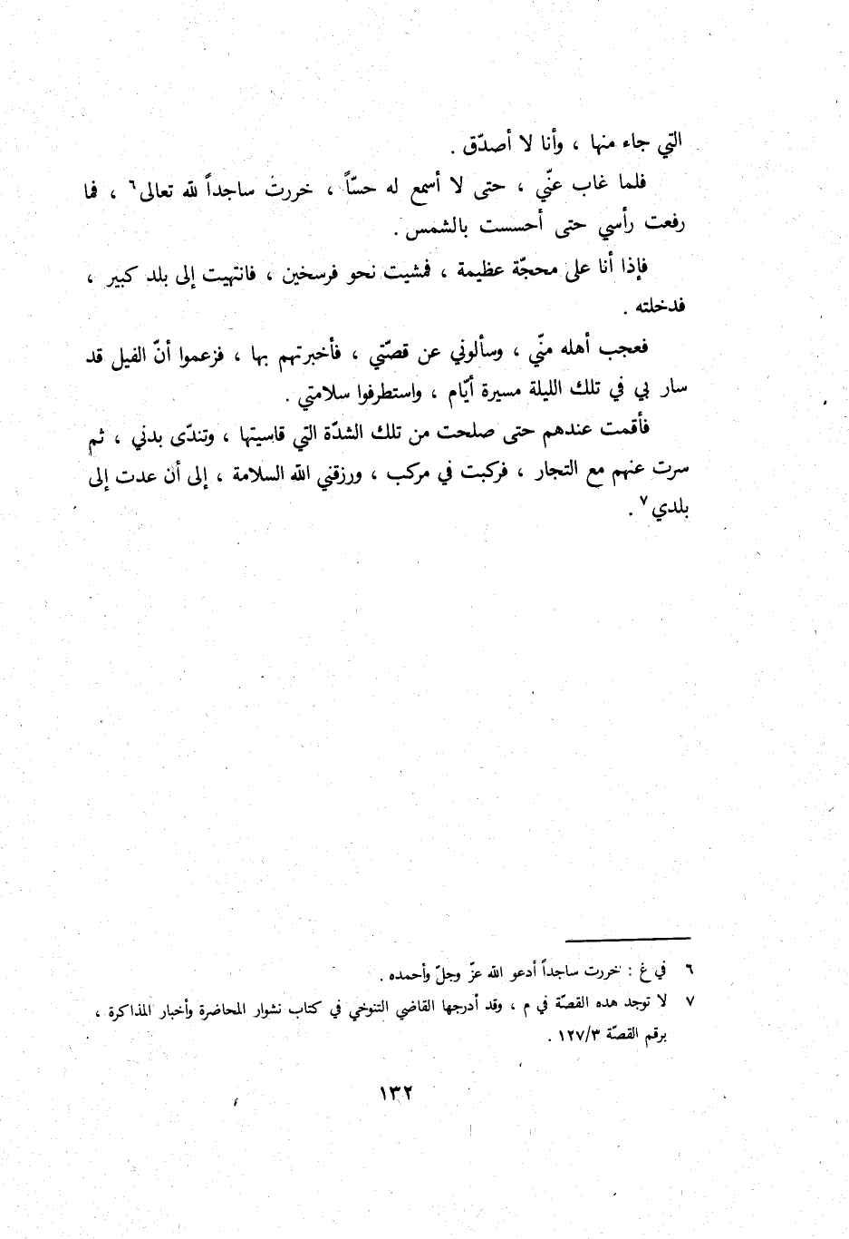 فأقمت عِنْدهم حَتَّى صلحت من تِلْكَ الشدَّة الَّتِي قاسيتها، وتندى بدني، ثمَّ سرت عَنْهُم مَعَ التُّجَّار، فركبت فِي مركب، وَرَزَقَنِي الله السَّلامَة، إِلَى أَن عدت إِلَى بلدي.