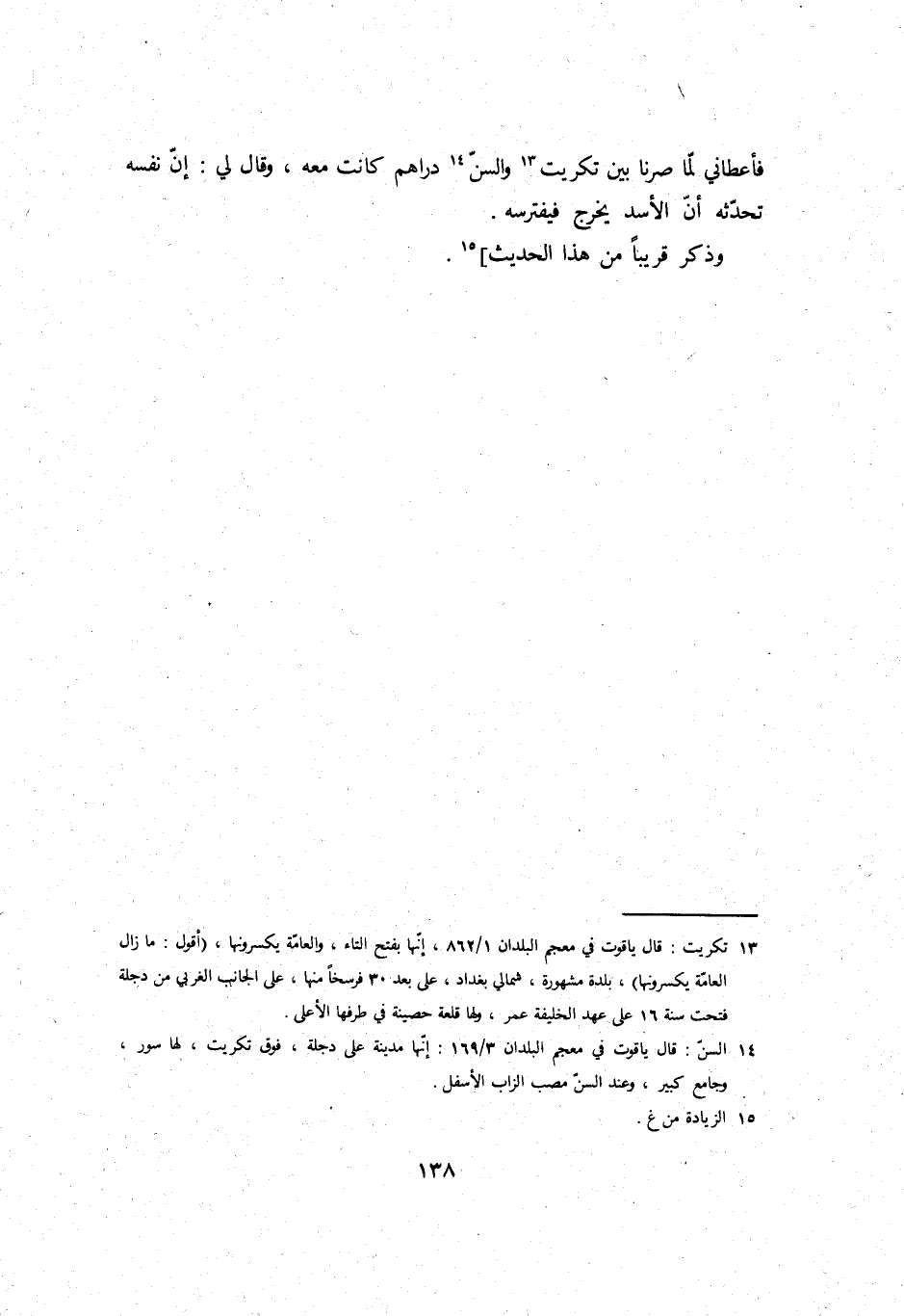 فَأَعْطَانِي لما صرنا بَين تكريت وَالسّن دَرَاهِم كَانَت مَعَه، وَقَالَ لي: إِن نَفسه تحدثه أَن الْأسد يخرج فيفترسه.
