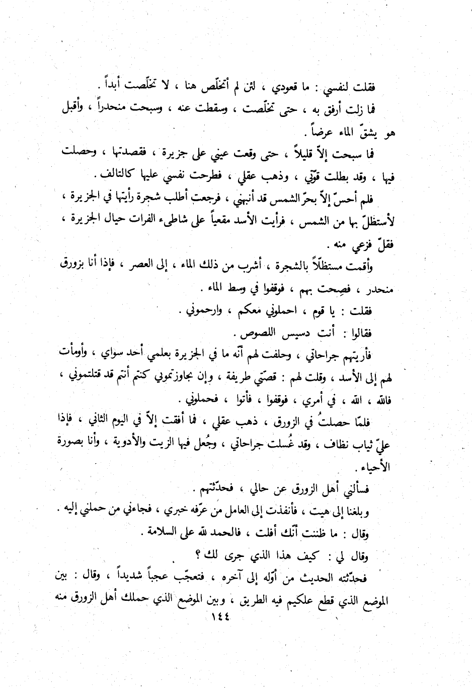 فأريتهم جراحاتي، وَحلفت لَهُم أَنه مَا فِي الجزيرة بعلمي أحد سواي، وأومأت لَهُم إِلَى الْأسد، وَقلت لَهُم: قصتي طريفة، وَإِن تجاوزتموني كُنْتُم أَنْتُم قد قتلتموني، فَالله، الله، فِي أَمْرِي، فوقفوا، فَأتوا، فحملوني.