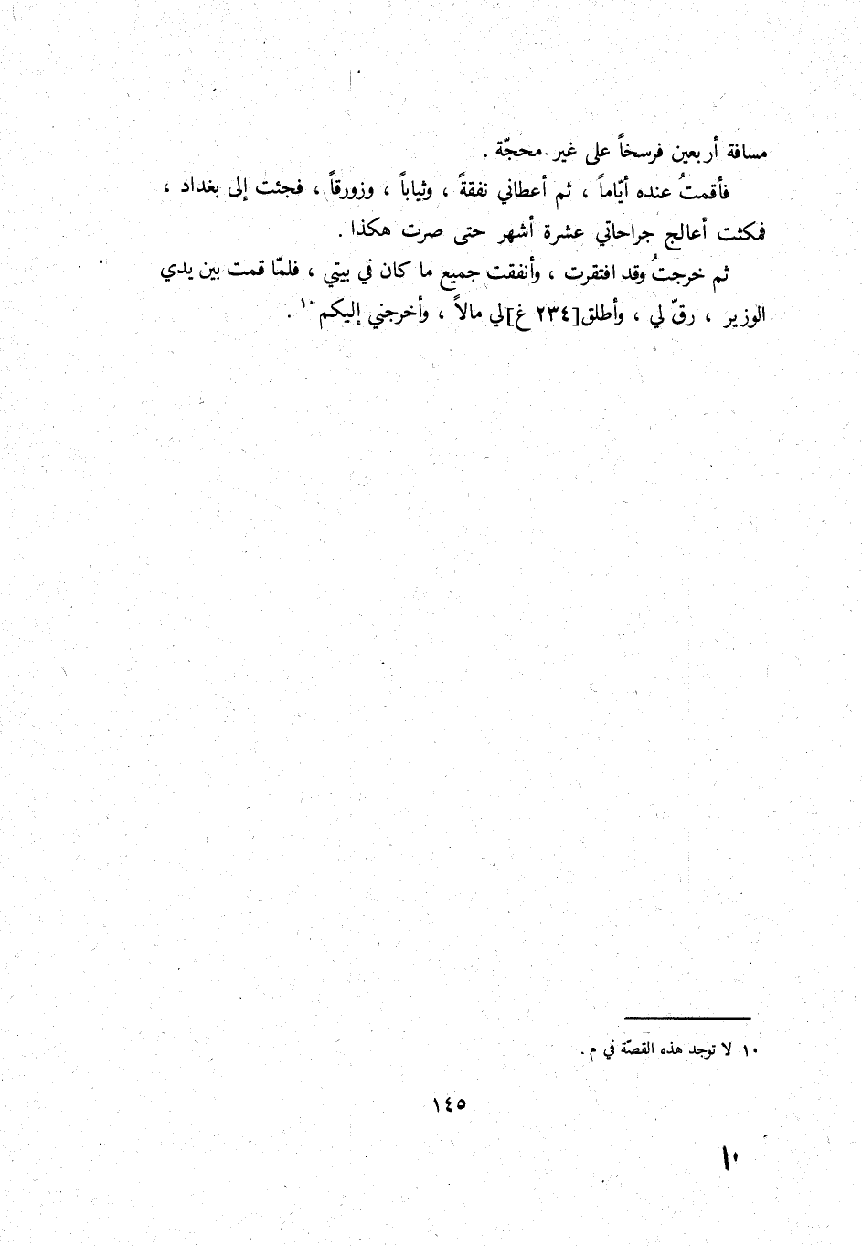 فأقمت عِنْده أَيَّامًا، ثمَّ أَعْطَانِي نَفَقَة، وثيابًا، وزورقًا، فَجئْت إِلَى بَغْدَاد، فَمَكثت أعالج جراحاتي عشرَة أشهر حَتَّى صرت هَكَذَا.