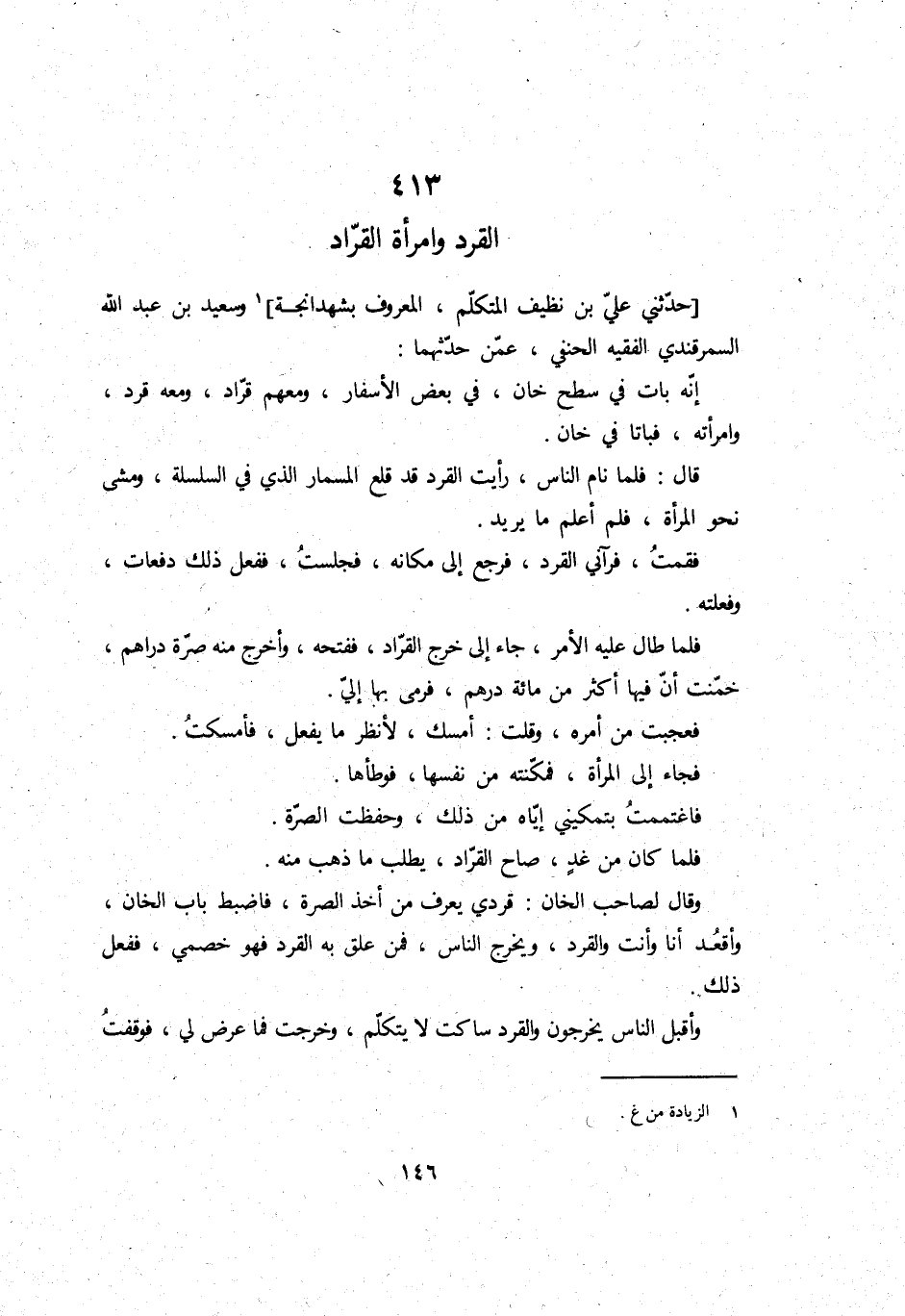حَدثنِي عَليّ بن نظيف الْمُتَكَلّم، الْمَعْرُوف بشهدانجة، وَسَعِيد بن عبد الله السَّمرقَنْدِي الْفَقِيه الْحَنَفِيّ، عَمَّن حَدثهمَا: إِنَّه بَات فِي سطح خَان، فِي بعض الْأَسْفَار، وَمَعَهُمْ قراد، وَمَعَهُ قرد، وَامْرَأَته، فباتا فِي خَان.