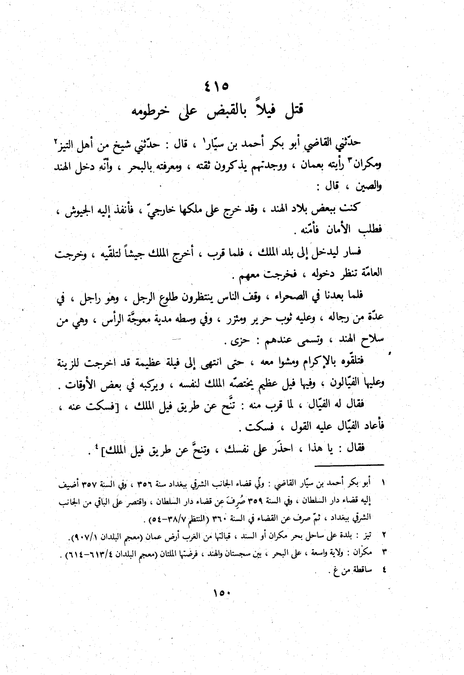 حَدثنِي القَاضِي أَبُو بكر أَحْمد بن سيار، قَالَ: حَدثنِي شيخ من أهل التيز ومكران رَأَيْته بعمان، ووجدتهم يذكرُونَ ثقته، ومعرفته بالبحر، وَأَنه دخل الْهِنْد والصين، قَالَ: كنت بِبَعْض بِلَاد الْهِنْد، وَقد خرج على ملكهَا خارجي، فأنفذ إِلَيْهِ الجيوش، فَطلب الْأمان فَأَمنهُ.