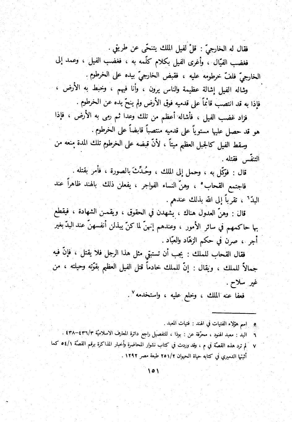 فَقَالَ القحاب للْملك: يجب أَن تستبقي مثل هَذَا الرجل فَلَا يقتل، فَإِن فِيهِ جمالًا للْملك، وَيُقَال: إِن للْملك خَادِمًا قتل الْفِيل الْعَظِيم بقوته وحيلته، من غير سلَاح.