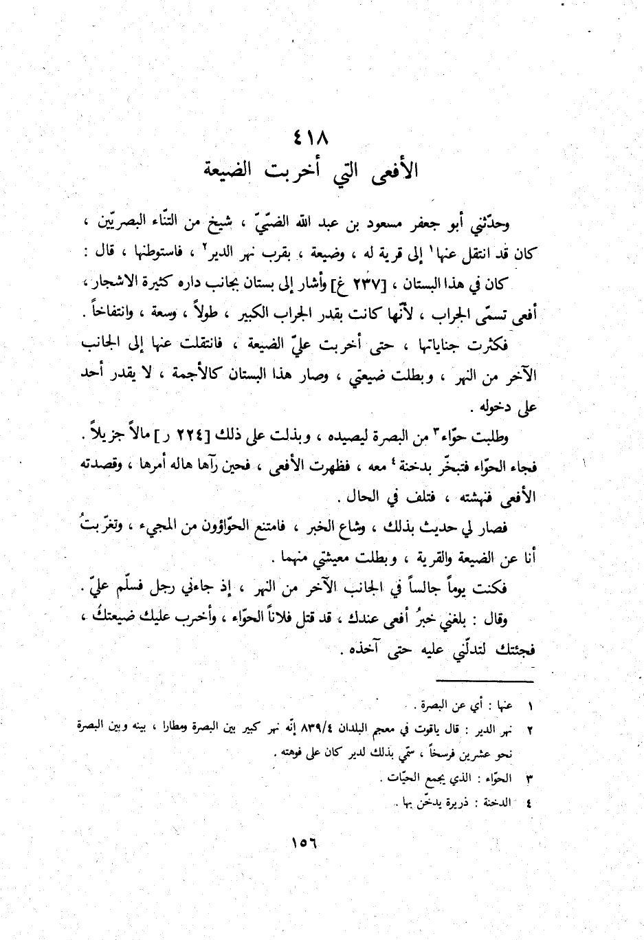 وحَدثني أَبُو جَعْفَر مَسْعُود بن عبد الله الضَّبِّيّ، شيخ من التناء الْبَصرِيين، كَانَ قد انْتقل عَنْهَا إِلَى قَرْيَة لَهُ، وضيعة، بِقرب نهر الدَّيْر، فاستوطنها، قَالَ: كَانَ فِي هَذَا الْبُسْتَان، وَأَشَارَ إِلَى بُسْتَان بِجَانِب دَاره كَثِيرَة الْأَشْجَار، أَفْعَى تسمى الجراب، لِأَنَّهَا كَانَت بِقدر الجراب الْكَبِير، طولا، وسعة، وانتفاخًا.