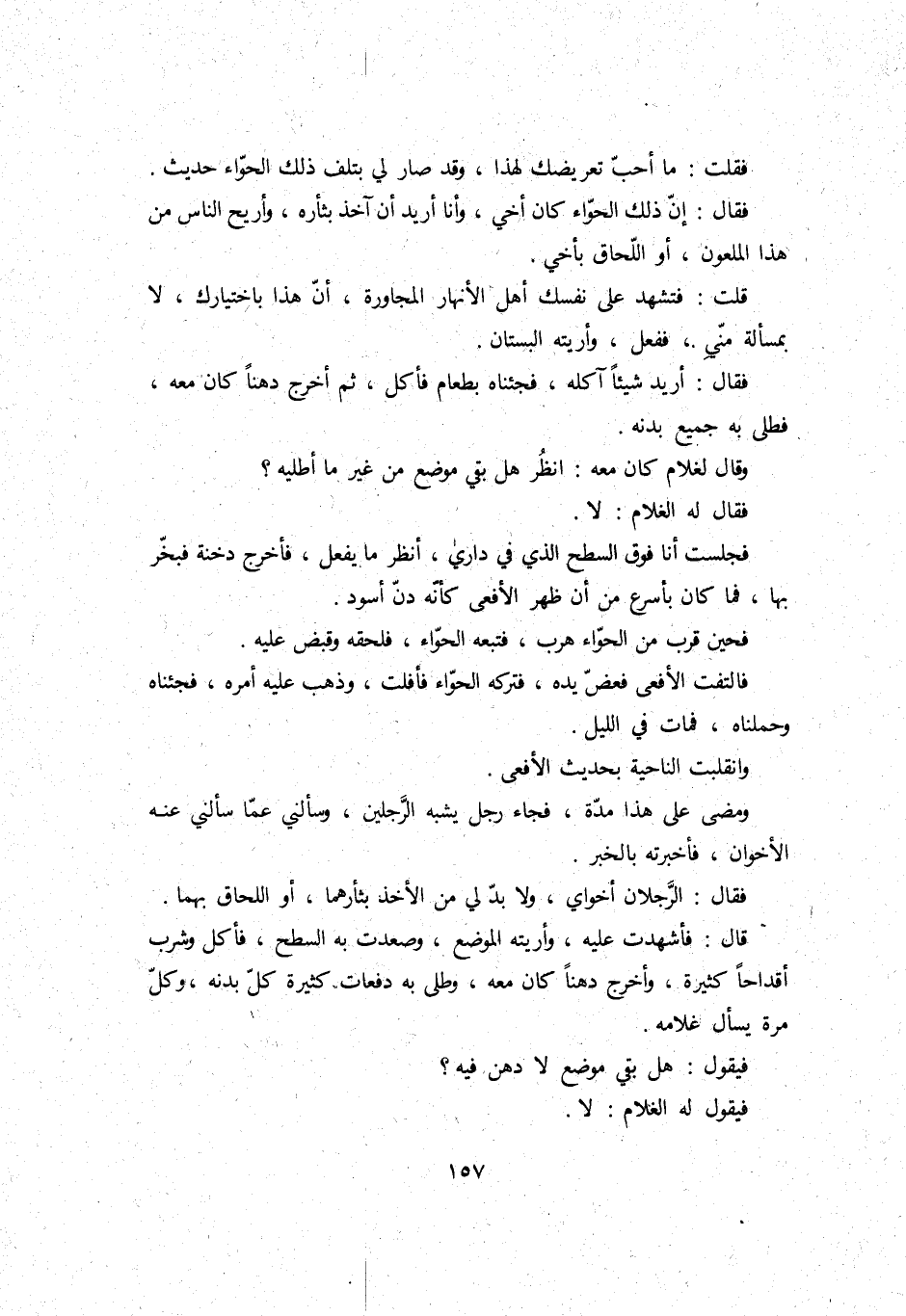 قَالَ: فأشهدت عَلَيْهِ، وأريته الْموضع، وصعدت بِهِ السَّطْح، فَأكل وَشرب أقداحًا كَثِيرَة، وَأخرج دهنًا كَانَ مَعَه، وطلى بِهِ دفعات كَثِيرَة كل بدنه، وكل مرّة يسْأَل غُلَامه.