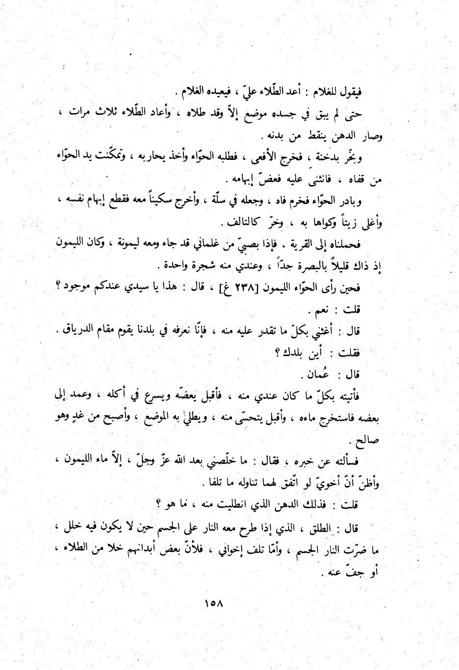 قلت: فَذَلِك الدّهن الَّذِي انطليت مِنْهُ، مَا هُوَ؟ قَالَ: الطلق، الَّذِي إِذا طرح مَعَه النَّار على الْجِسْم حِين لَا يكون فِيهِ خلل، مَا ضرت النَّار الْجِسْم، وَأما تلف إخْوَانِي، فَلِأَن بعض أبدانهم خلا من الطلاء، أَو جف عَنهُ.
