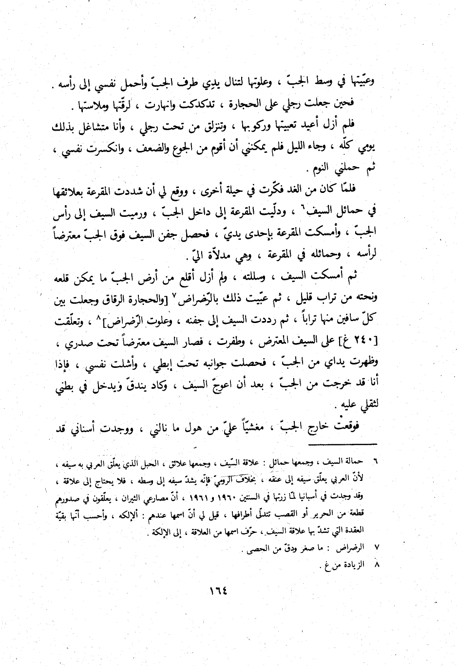 ثمَّ أَمْسَكت السَّيْف، وسللته، وَلم أزل أقلع من أَرض الْجب مَا يُمكن قلعه ونحته من تُرَاب قَلِيل، ثمَّ عبيت ذَلِك بالرضراض وَالْحِجَارَة الرقَاق وَجعلت بَين كل سافين مِنْهَا تُرَابا، ثمَّ رددت السَّيْف إِلَى جفْنه، وعلوت الرضراض، وتعلقت على السَّيْف الْمُعْتَرض، وطفرت، فَصَارَ السَّيْف مُعْتَرضًا تَحت صَدْرِي، وَظَهَرت يداي من الْجب، فحصلت جوانبه تَحت إبطي، وأشلت نَفسِي، فَإِذا أَنا قد خرجت من الْجب، بعد أَن اعوج السَّيْف، وَكَاد يندق وَيدخل فِي بَطْني لثقلي عَلَيْهِ.