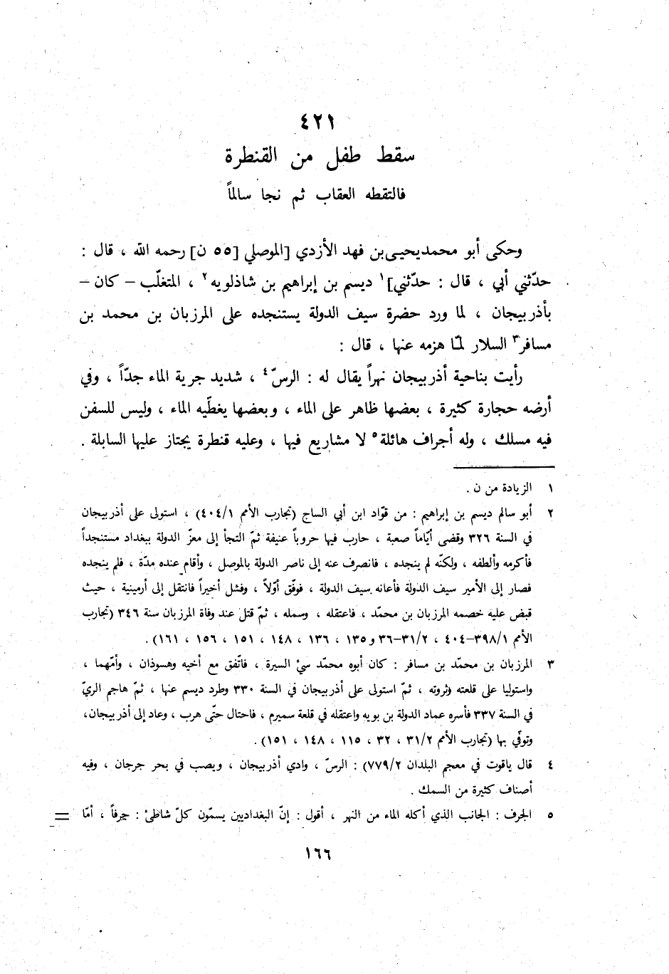 وَحكى أَبُو مُحَمَّد يحيى بن فَهد الْأَزْدِيّ رَحمَه الله، قَالَ: حَدثنِي أبي، قَالَ: حَدثنِي ديسم بن إِبْرَاهِيم بن شاذلويه، المتغلب، كَانَ، بِأَذربِيجَان، لما ورد حَضْرَة سيف الدولة يستنجده على الْمَرْزُبَان بن مُحَمَّد بن مُسَافر السلار لما هَزَمه عَنْهَا، قَالَ: رَأَيْت بِنَاحِيَة أذربيجان نَهرا يُقَال لَهُ: الرس، شَدِيد جرية المَاء جدا، وَفِي أرضه حِجَارَة كَثِيرَة، بَعْضهَا ظَاهر على المَاء، وَبَعضهَا يغطيه المَاء، وَلَيْسَ للسفن فِيهِ مَسْلَك، وَله أجراف هائلة لَا مشاريع فِيهَا، وَعَلِيهِ قنطرة يجتاز عَلَيْهَا السابلة.