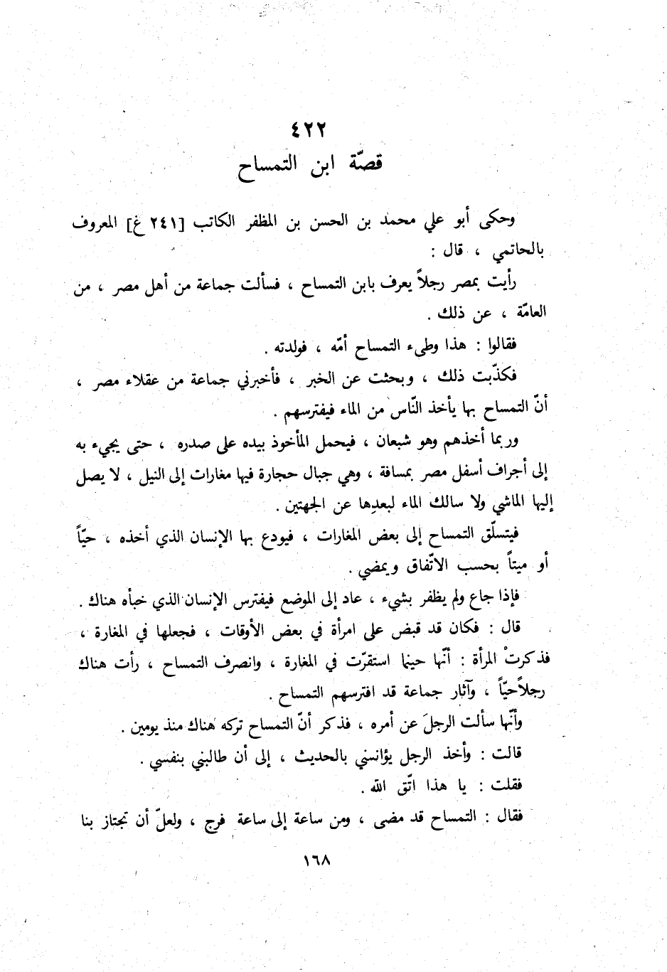 وَحكى أَبُو عَليّ مُحَمَّد بن الْحسن بن المظفر الْكَاتِب الْمَعْرُوف بالحاتمي، قَالَ: رَأَيْت بِمصْر رجلا يعرف بِابْن التمساح، فَسَأَلت جمَاعَة من أهل مصر، من الْعَامَّة، عَن ذَلِك.