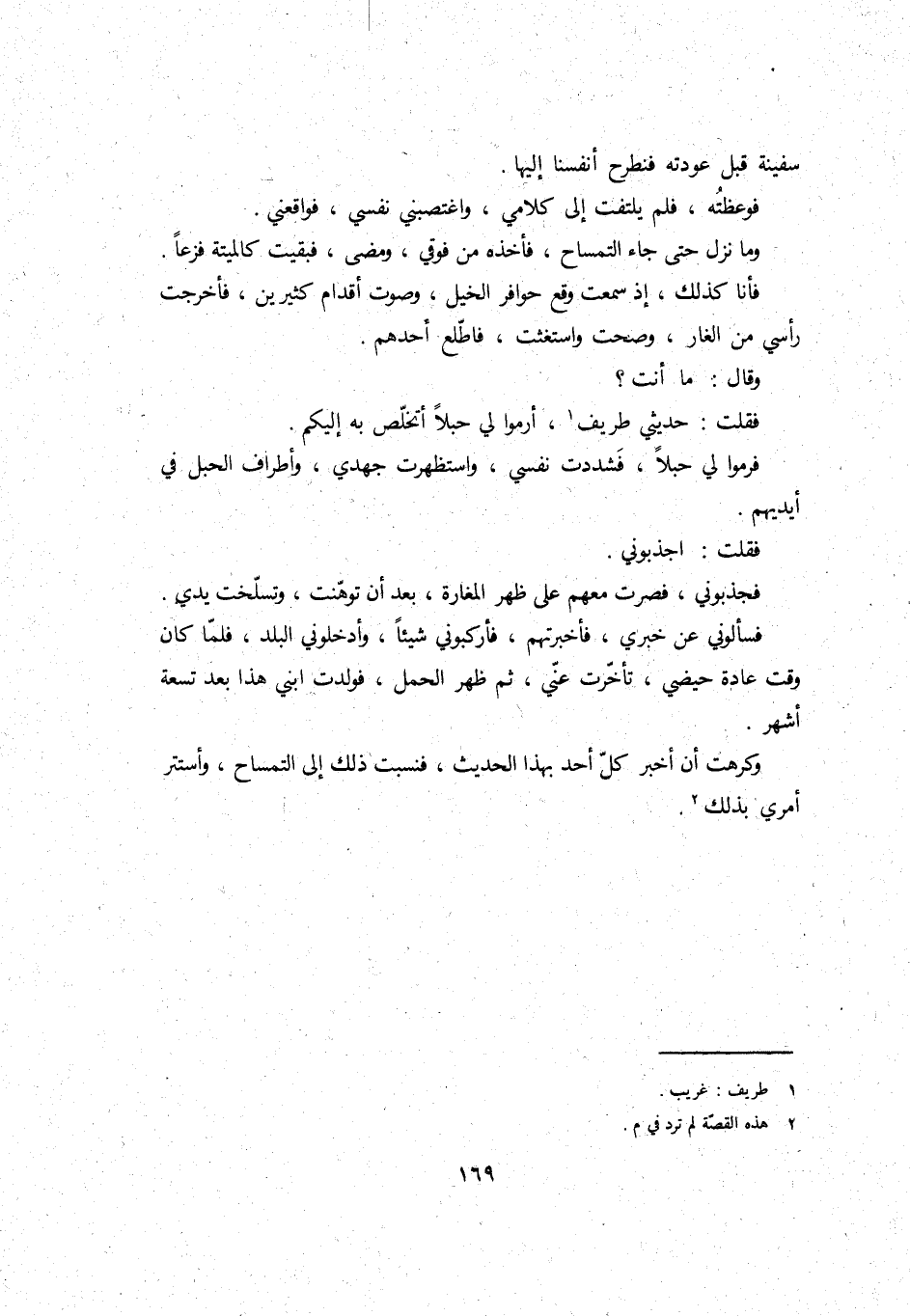 فسألوني عَن خبري، فَأَخْبَرتهمْ، فأركبوني شَيْئا، وأدخلوني الْبَلَد، فَلَمَّا كَانَ وَقت عَادَة حيضي، تَأَخَّرت عني، ثمَّ ظهر الْحمل، فَولدت ابْني هَذَا بعد تِسْعَة أشهر.