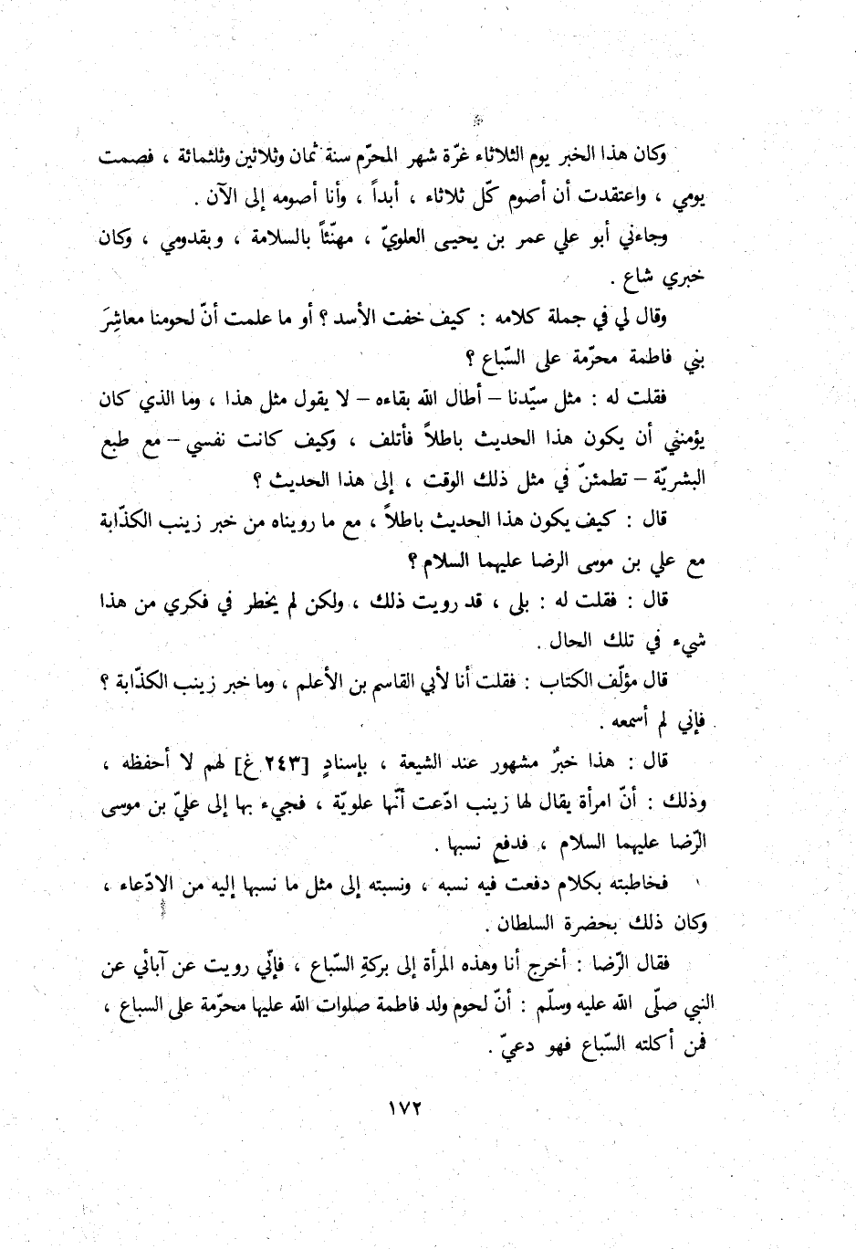وَقَالَ لي فِي جملَة كَلَامه: كَيفَ خفت الْأسد؟ أَو مَا علمت أَن لحومنا معاشر بني فَاطِمَة مُحرمَة على السبَاع؟ فَقلت لَهُ: مثل سيدنَا، أَطَالَ الله بَقَاءَهُ، لَا يَقُول مثل هَذَا، وَمَا الَّذِي كَانَ يؤمنني أَن يكون هَذَا الحَدِيث بَاطِلا فأتلف، وَكَيف كَانَت نَفسِي، مَعَ طبع البشرية، تطمئِن فِي مثل ذَلِك الْوَقْت، إِلَى هَذَا الحَدِيث؟ قَالَ: كَيفَ يكون هَذَا الحَدِيث بَاطِلا، مَعَ مَا روينَاهُ من خبر زَيْنَب الكذابة مَعَ عَليّ بن مُوسَى الرِّضَا عَلَيْهِمَا السَّلَام؟ قَالَ: فَقلت لَهُ: بلَى، قد رويت ذَلِك، وَلَكِن لم يخْطر فِي فكري من هَذَا شَيْء فِي تِلْكَ الْحَال.
