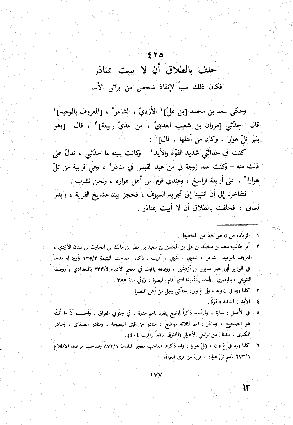 حلف بِالطَّلَاق أَن لَا يبيت بمناذر فَكَانَ ذَلِك سَببا لإنقاذ شخص من براثن الْأسد