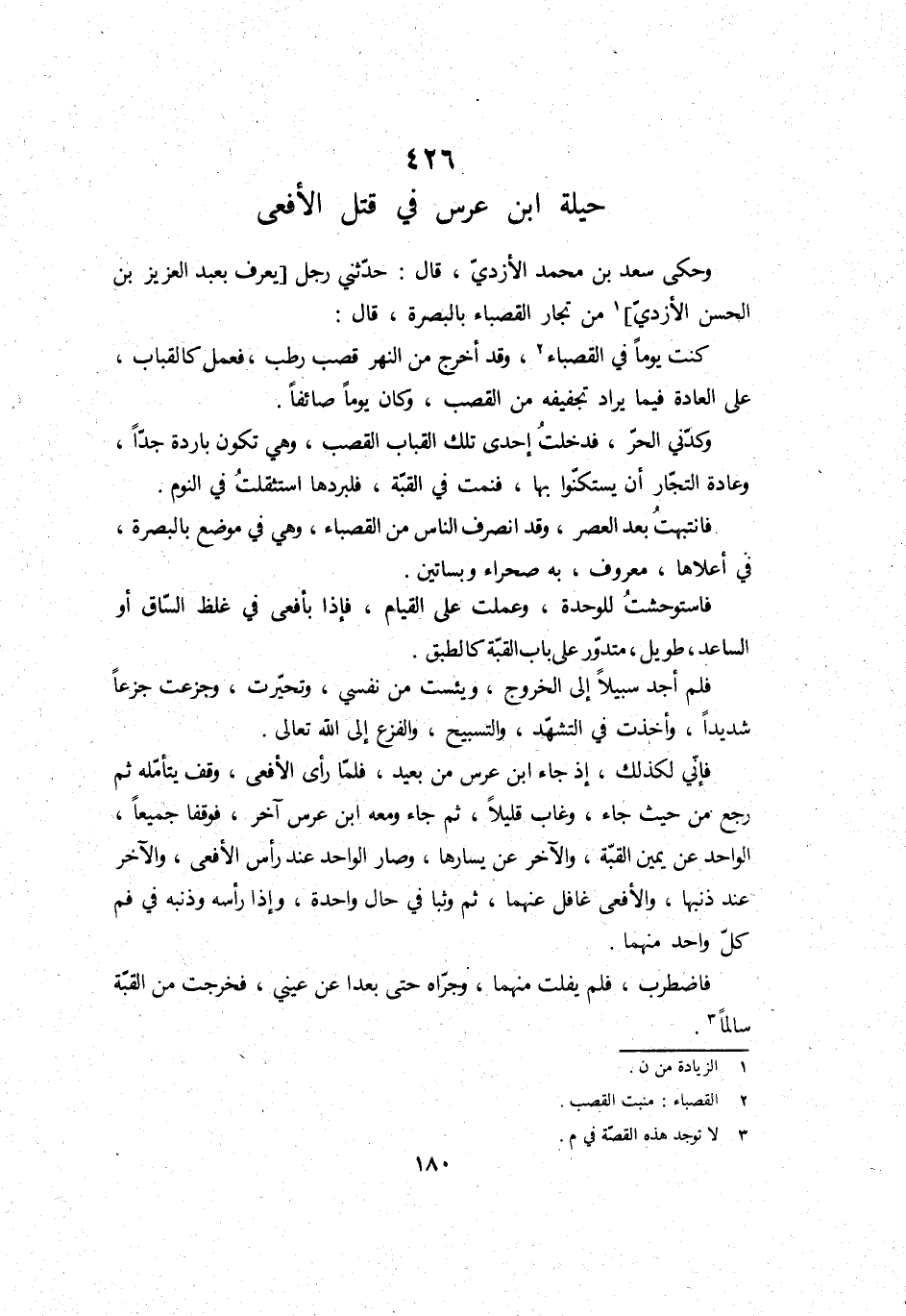 فانتبهت بعد الْعَصْر، وَقد انْصَرف النَّاس من القصباء، وَهِي فِي مَوضِع بِالْبَصْرَةِ، فِي أَعْلَاهَا، مَعْرُوف، بِهِ صحراء وبساتين.