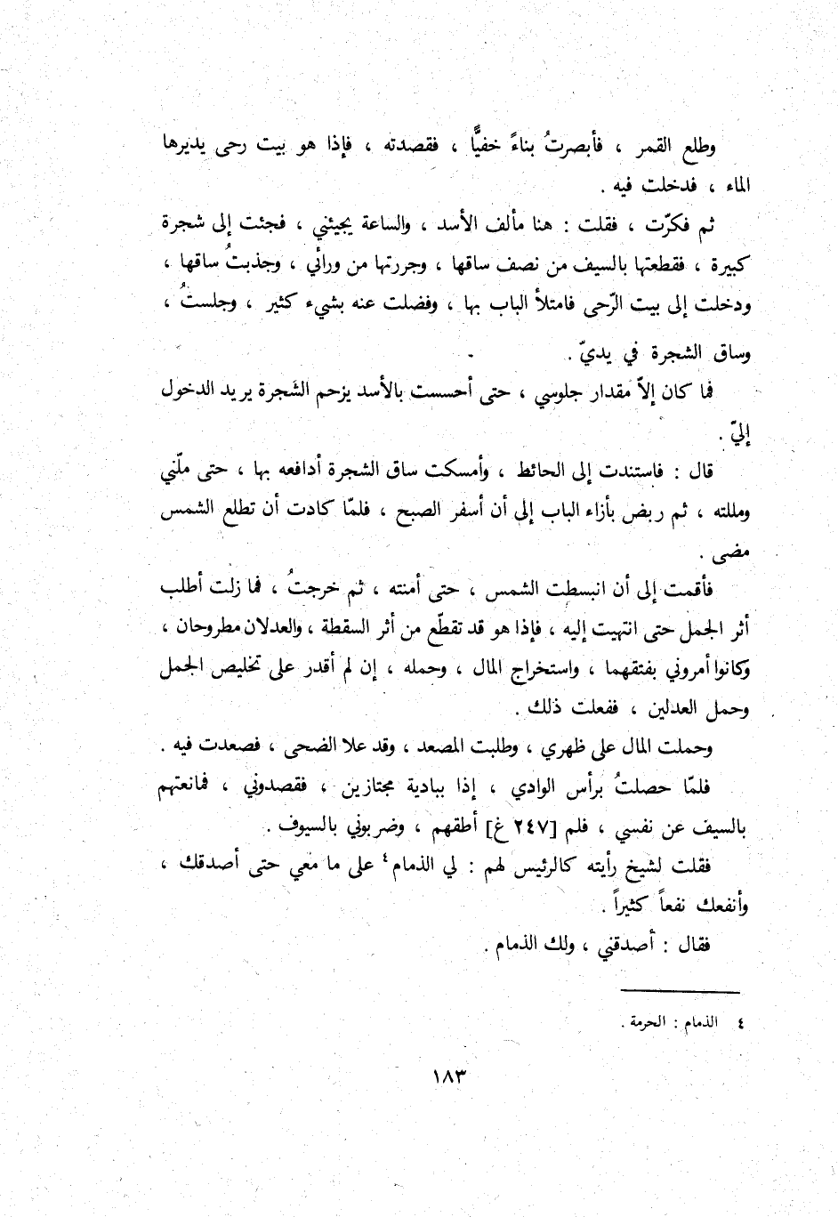 ثمَّ فَكرت، فَقلت: هُنَا مألف الْأسد، والساعة يجيئني، فَجئْت إِلَى شَجَرَة كَبِيرَة، فقطعتها بِالسَّيْفِ من نصف سَاقهَا، وجررتها من ورائي، وجذبت سَاقهَا، وَدخلت إِلَى بَيت الرَّحَى، فَامْتَلَأَ الْبَاب بهَا، وفضلت عَنهُ بِشَيْء كثير، وَجَلَست، وسَاق الشَّجَرَة فِي يَدي.